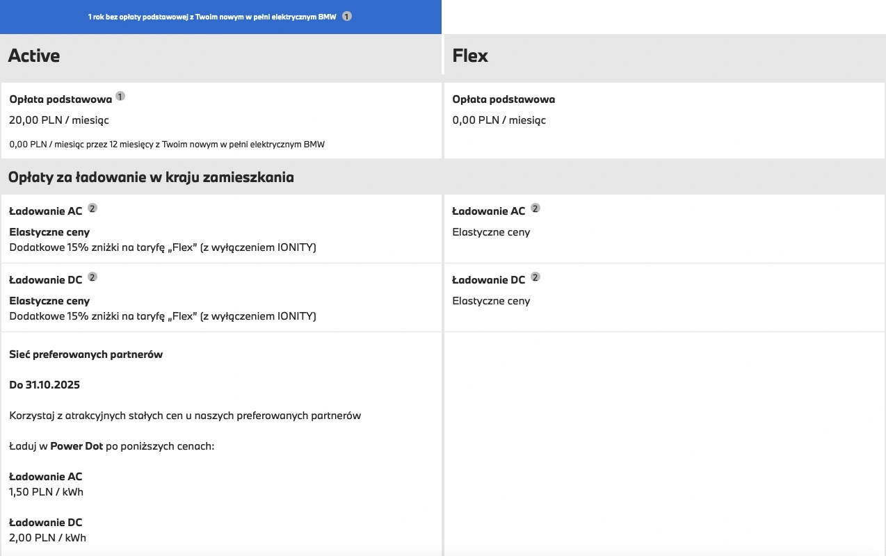 Sporo aut elektrycznych sprzedaje też BMW. Oferuje do nich karty, które dają dostęp do ładowarek w całej Europie. Możemy nie płacić nic, wybierając taryfę Flex lub 20 zł miesięcznie (pierwszy rok za darmo), gdy zdecydujemy się na taryfę Active, która obniża ceny. Ale tego, ile zapłacimy za każdą setkę, policzyć się nie da.