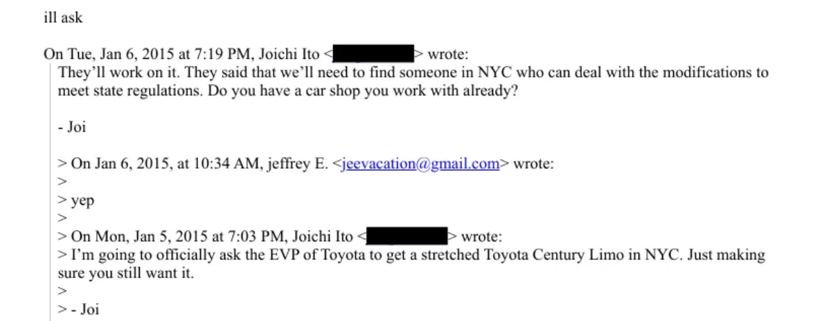 Jak możemy wyczytać z akt Epsteina, pod koniec 2014 roku i na początku 2015 roku ich główny bohater zażyczył sobie sprowadzenia na teren Stanów Zjednoczonych Toyoty Century - luksusowej, choć tradycjonalistycznie stylizowanej limuzyny. A także jedynego japońskiego samochodu osobowego wyposażonego w silnik V12 krajowej produkcji. Jako człowiekowi z kontaktami udało mu się ominąć standardowe kanały i poprzez swojego przyjaciela, inwestora z Japonii Joichiego Ito porozmawiać z osobą z centrali Toyoty.