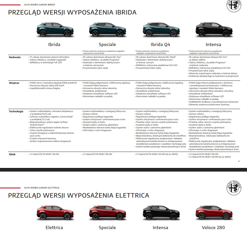Teraz, w przypadku wersji z silnikiem spalinowym, "bazowy" Junior to Ibrida, powyżej niego jest kolejno: Sprint, TI oraz Sport Speciale. Elektryczny SUV ma niemal takie same wersje wyposażenia, z tą różnicą, że najniższa wersja to elettrica, a najwyższa - dodatkowa - Veloce 280.