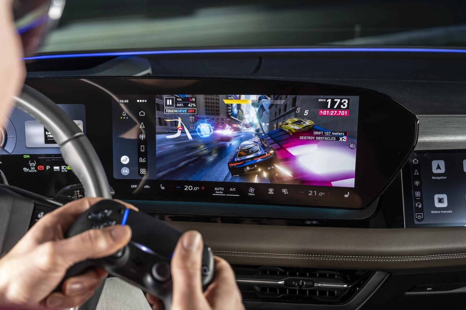 Od tego wszystkiego można się pogubić, dlatego Audi dodało jeszcze ustawienia nastrojowe, które dopasują oświetlenie, dźwięk, tryb masażu i klimatyzację, by zrelaksować kierowcę. Poszczególne „scenariusze” trwają od dziesięciu do dwudziestu minut. Jeśli od ilości bajerów szybciej padnie akumulator, możecie też skorzystać z trybu Power Nap, który znajdziecie w elektrycznych modelach. Podczas ładowania pozwoli nieco się odprężyć. Jeżeli zamiast drzemki wolicie w coś pograć, możecie połączyć kontroler i słuchawki przez Bluetooth.