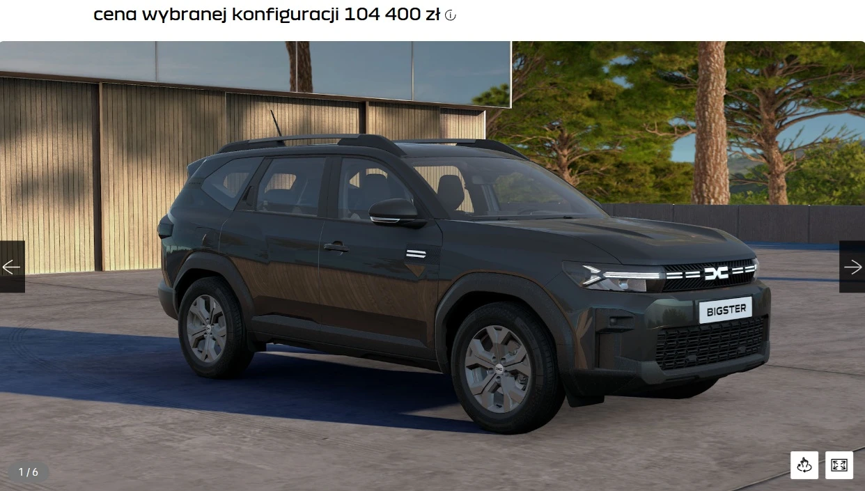 Na pierwszy ogień niech będzie Dacia - kiedy chodzi o cenę, nie można nie wspomnieć o rumuńskiej marce. Tak się składa, że jej flagowy model Bigster w podstawowej wersji Essential kosztuje od 101 300 zł, czyli mniej od roweru Bugatti. Co prawda wyposażenie jest dość ubogie, ale znajdziemy tu m.in. 10-calowy ekran do obsługi multimediów, klimatyzację manualną czy kamerę cofania. Opcji też nie ma za wiele - dodaliśmy tylko wymagający dopłaty lakier Czarna Pełna, bo czarne auta wyglądają drożej. Ale i tak ma przewagę nad rowerem, gdyż posiada choćby dach czy 5 miejsc siedzących, kosztując mniej.