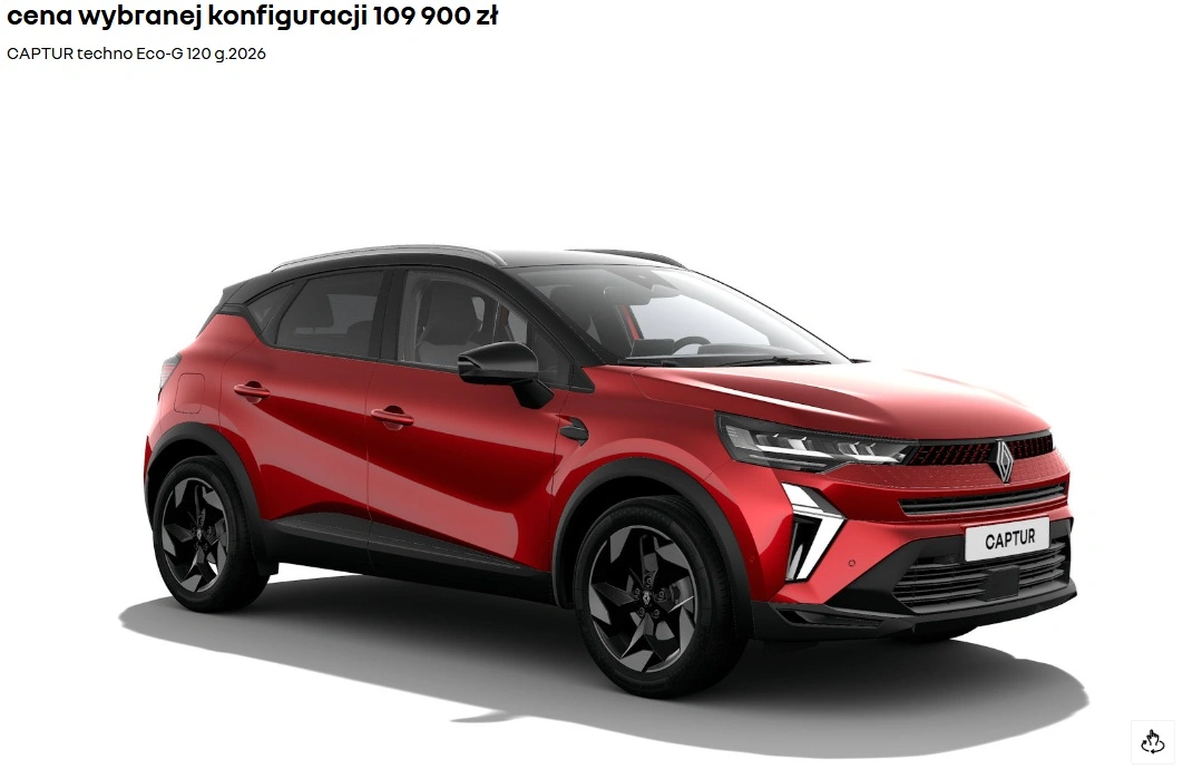 Żeby pozostać w koncernie Renault, jako drugi niech będzie Captur z silnikiem Eco-G 120 z fabryczną instalacją LPG, w drugiej w kolejności wersji wyposażenia Techno. Znajdziemy w niej m.in. klimatyzację automatyczną, 18-calowe aluminiowe felgi, przyciemniane szyby, czy skórzaną kierownicę. Dobrałem jeszcze czarny dach, relingi dachowe i ładowarkę indukcyjną, a i tak wyszło mniej niż za rower.