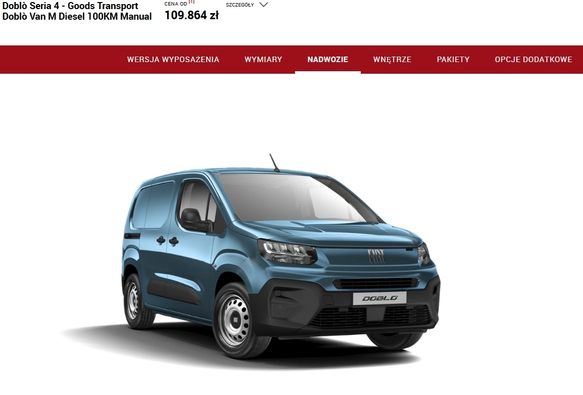 Przydałoby się też coś dostawczego - nie ma problemu, jest Fiat Doblo za 109 864 zł (oczywiście netto). Może nie pomoże całej rodzinie w przeprowadzce, ale i tak można nim przewieść więcej niż Bugatti, które w standardzie nie ma nawet uchwytu na bidon. Doblo napędza niewielki diesel 1,5 l o mocy 100 KM, a w wyposażeniu znalazły się tylne czujniki parkowania, klimatyzacja manualna czy tempomat. Z dodatków wybraliśmy jedynie wykładzinę przestrzeni ładunkowej z polipropylenu, dla bezpieczeństwa przewożonych towarów i metalizowany lakier "Niebieski Volare", bo jest bardzo ładny.