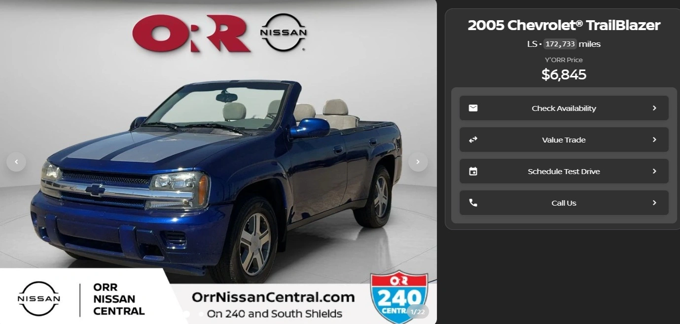 O właścicielu nie ma zbyt wielu informacji - sprzedający piszą, że starszy pan zostawił go w rozliczeniu. Zresztą, sam sprzedający go dealer Nissana z Oklahoma City wydaje się nie zauważać brakującego dachu - w ogłoszeniu nie wspomniano tym ani słowa i brzmi on, jakby dotyczył najzwyklejszego TrailBlazera.