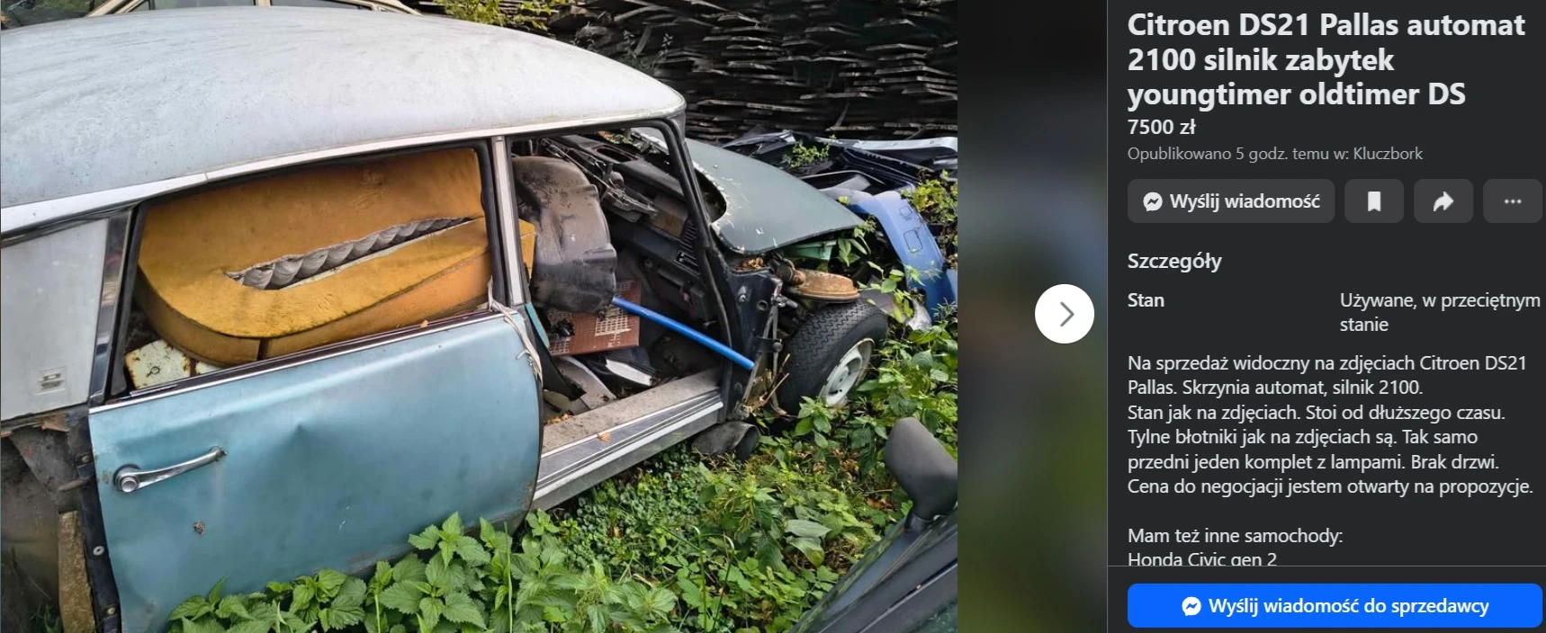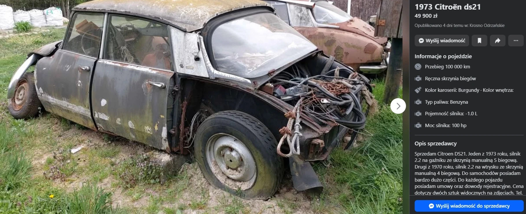 I tutaj w zasadzie kończą się ciekawe, polskie ogłoszenia. Na pomniejszych portalach, jeżeli w ogóle znajduje się kategoria "Citroen DS", to pod nią znajdziemy jedynie współczesne DS-y. Na facebookowym Marketplace znalazły się jeszcze dwa ogłoszenia (w tym jedno z dwoma autami na raz) - ale powiedzieć, że są "do renowacji", to jak powiedzieć, że młoda Brigitte Bardot była "całkiem niezła".