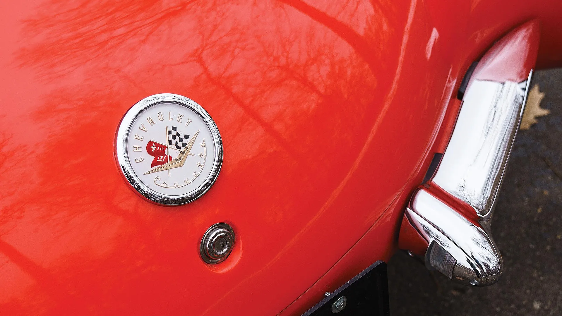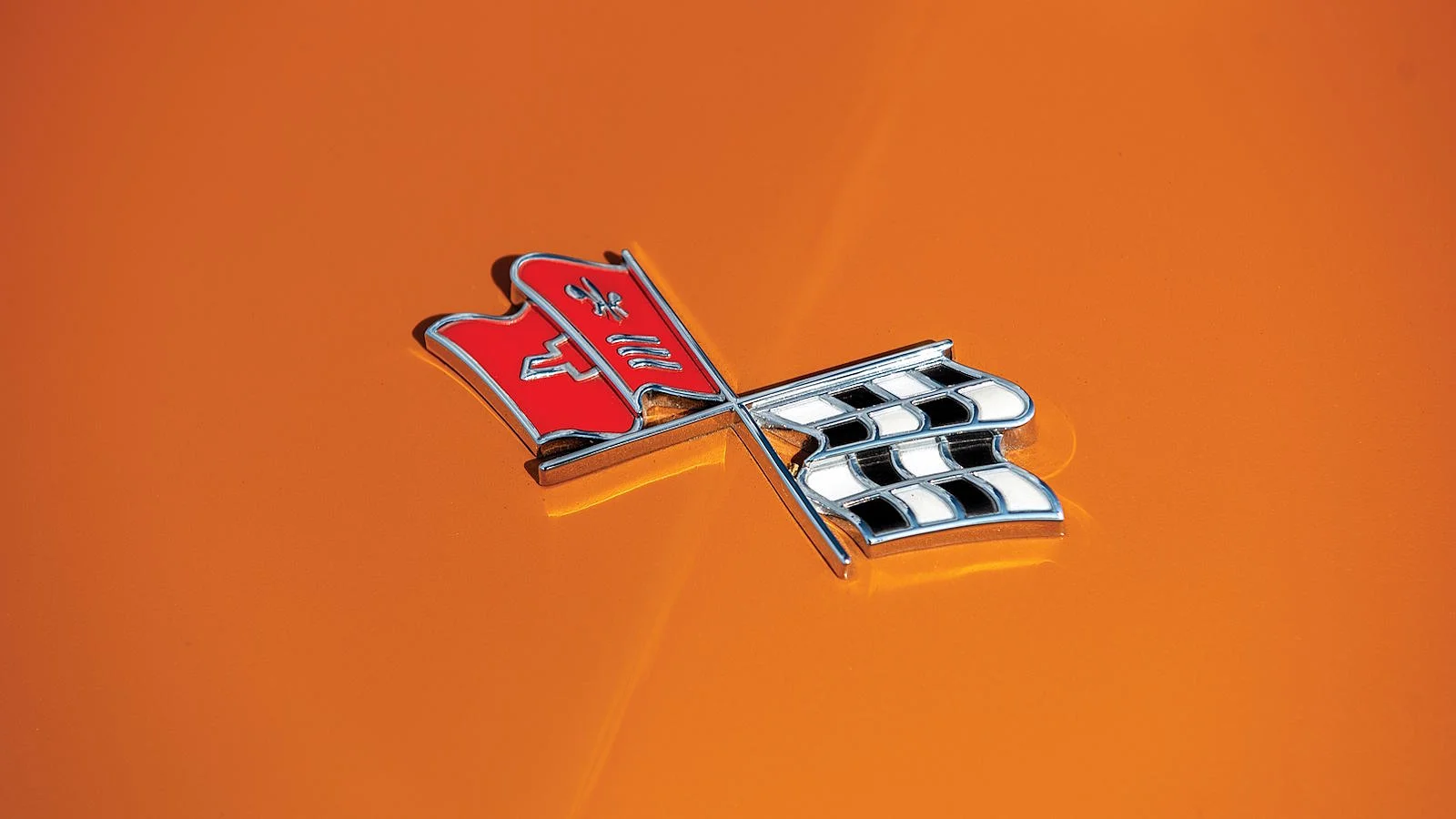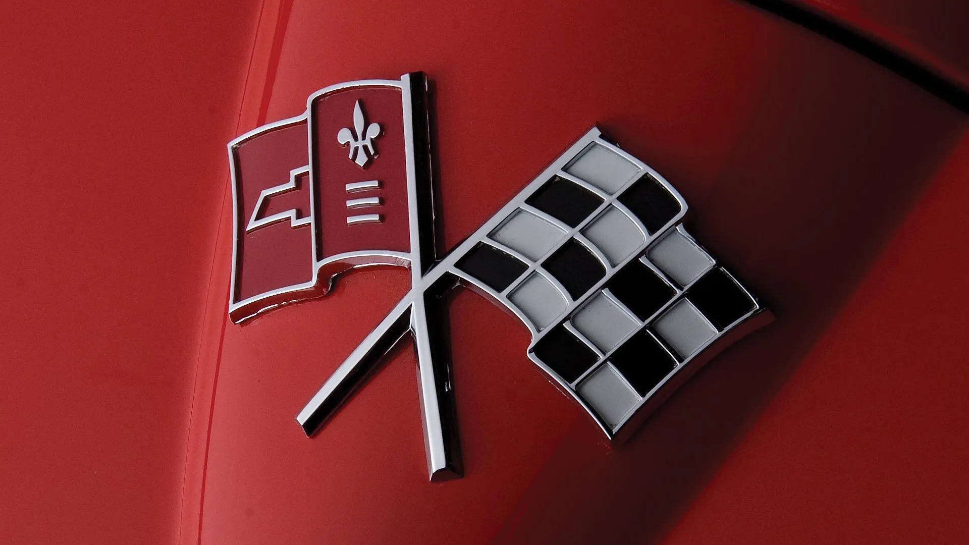 Oczywiście takie pierwsze-pierwsze logo było gotowe znacznie wcześniej, ale był z nim pewien kłopot: obok flagi z tradycyjną wyścigową szachownicą, projektant Robert Bartholomew zawarł tam też flagę amerykańską. A tej zawrzeć nie można było na samochodowym znaczku, ponieważ byłoby to naruszenie prawa federalnego. Bartholomew postanowił więc narysować flagę z kwiatem lilii, symbolem szeroko stosowanym w heraldyce, uzupełnionym przez trzy poziome linie oraz tarczę z charakterystycznym krzyżem Chevroleta. Flagi umieszczono w okręgu, w którym znalazł się także napis Chevrolet Corvette.
