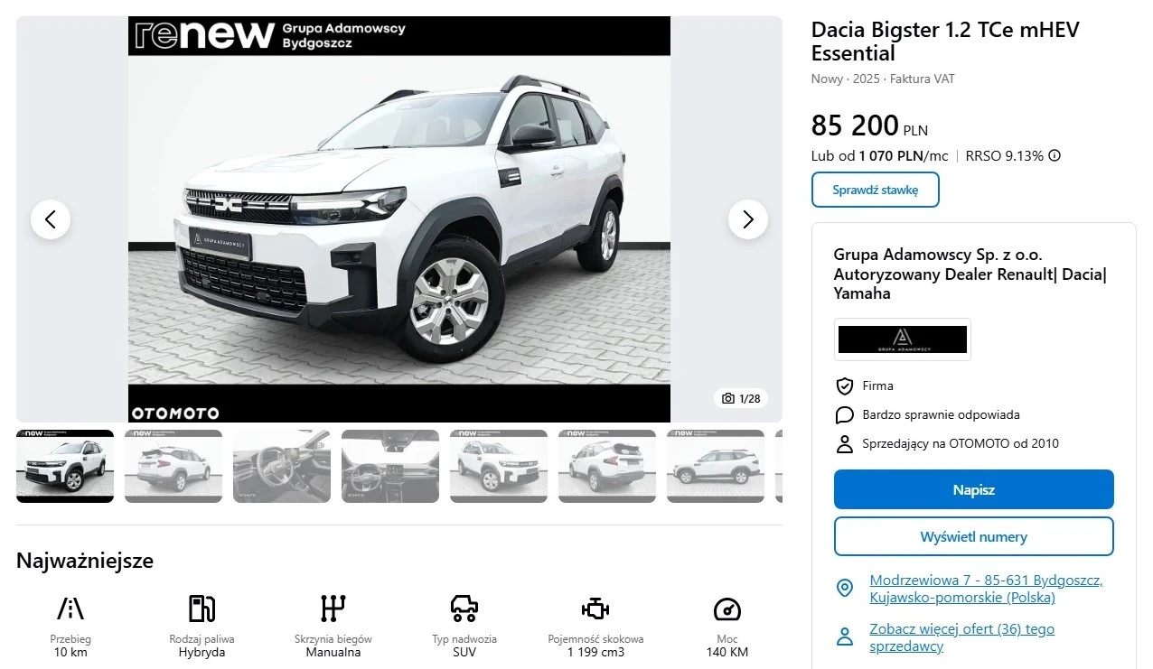 Mowa bowiem o ofercie bydgoskiego dealera Dacii, który opublikował ogłoszenie dotyczące Bigstera w wersji wyposażenia Essential i z silnikiem mild hybrid 140. Zanim rozszyfrujemy, co dokładnie kryje się za tymi oznaczeniami, dodam tylko, że cena katalogowa tego egzemplarza to 102 200 zł, ale po rabacie możecie go mieć za 85 200 zł, więc o 17 000 zł mniej. Samochód wyprodukowano w 2025 roku, ma 10 km przebiegu, a po raz pierwszy został zarejestrowany 29 grudnia.