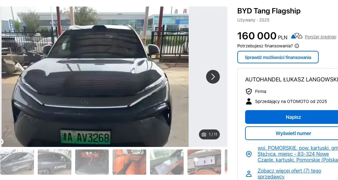 Nie jestem nawet pewien, czy ten wóz faktycznie znajduje się w Polsce, ale na zdjęciach ma chińskie tablice rejestracyjne dla samochodów elektrycznych. BYD Tang to SUV klasy wyższej, początkowo dostępny też jako spalinowy – teraz jest już elektryczny. Jest to idealny pojazd dla kogoś, kto bardzo chce mieć największy akumulator w samochodzie na prąd. BYD Tang z baterią Blade-LFP zmieści prawie 109 kWh energii. To niesamowita ilość, która przy rozsądnym używaniu pedału gazu pozwoli przejechać ponad 700 km między ładowaniami. Trzeba jednak pamiętać, że samochody importowane z Chin mają inne standardy wtyczek do ładowania, co wymaga korzystania z przejściówek. Poza tym podkreślam, że mowa o wozie z 2025 r. za 160 tys. zł, który nie ma gwarancji, bo ta chińska w Europie nie obowiązuje. Ktoś chętny?