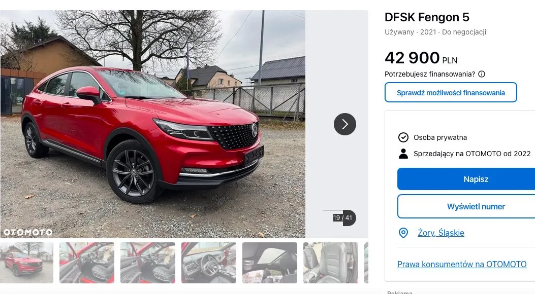 Charakterystyczne dla chińskich aut jest to, że nikt specjalnie nie wie, jak się nazywają. Co jest marką, a co modelem – nie wiadomo. Ten pojazd to teoretycznie Dongfeng albo DFSK, ale na tylnej klapie mamy napis Fengon, a obok jeszcze – Glory i oznaczenie 220T. Nie oferowano go nigdy w Polsce, przez krótki czas istniał niemiecki dealer tych pojazdów. Nie ma żadnej hybrydy ani elektryfikacji, to po prostu benzynowy 1.5 turbo z automatyczną skrzynią biegów z nadwoziem podobno w stylu „SUV-a coupe”. Dla mnie to raczej wygląda jakby ktoś niósł projekty Kii XCeed do zatwierdzenia i jeden mu wypadł, a potem znalazł go ktoś z Dongfenga i tak powstał Fengon. Za ten ekstremalnie nieciekawy pojazd trzeba zapłacić 42 900 zł. Jak na 4-latka, to bardzo dobra cena. W razie stłuczki z naszej winy albo założymy części z innego auta, albo wyślemy Fengona na złom.