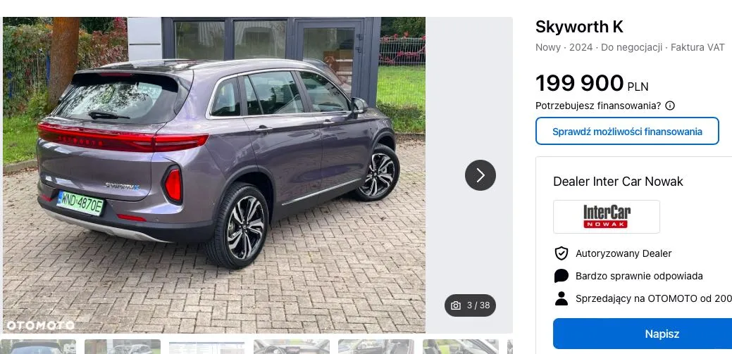 Ostatnio internet obiegła wiadomość o tym, że ktoś wystawia na sprzedaż dwu- albo trzyletniego Seresa za ok. 50 tys. zł – auto jako nowe było warte 170 tys. zł. Tu mamy podobną sytuację, tyle że od drugiej strony: dealer oferuje samochód elektryczny zupełnie nieznanej marki Skyworth - gdyby ktoś był ciekaw, to Skyworth i Skywell to ten sam producent. Pojazd pochodzi z 2024 r., ale jest już zarejestrowany, więc biegnie mu gwarancja. Duży akumulator – aż 86 kWh – pozwoli przejechać ponad 400 km po naładowaniu do 100 proc., ale trudno mi się jakoś pogodzić z tym, że ktoś chce za to 200 tys. zł. Bardzo jestem ciekaw, jak to się dalej potoczy, czy ktoś faktycznie przyjdzie do salonu i powie „wezmę to”? Wydaje się to mało prawdopodobne, a jednak, jak uczy mnie wieloletnie doświadczenie – to się zdarza. Potem trzeba będzie poczekać jeszcze 3 lata i napisać wpis o tym, ile stracił na wartości taki Skyworth.