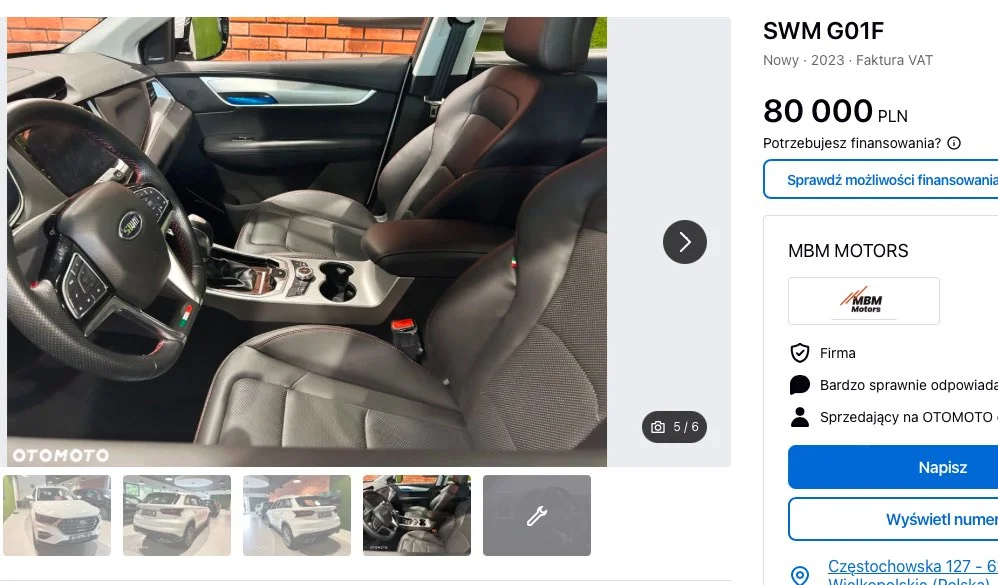 Mój kolega chciał wypożyczyć na wakacjach Nissana Qashqaia, a dostał ten wynalazek pod nazwą SWM. Jest to SUV marki Brilliance, tej samej która atakowała Europę swoimi sedanami we wczesnych latach 2000. bez istotnych sukcesów. W kategorii generycznych SUV-ów przebija nawet tego Fengona z początku przeglądu. Pod maską oczywiście silnik 1.5, prawdopodobnie spokrewniony z Mitsubishi. Nie spodziewałem się nawet, że w Polsce istnieje przedstawicielstwo SWM, ale jest i oferuje nam biały pojazd o wnętrzu zauważalnie innym niż w tym aktualnie oferowanym na stronie. Powiedziałbym, że ze zdjęcia tego auta z ogłoszenia już wyczuwam zapach tych foteli ze sztucznej skóry i tych chińskich plastików. Ale 80 000 zł za nowego SUV-a klasy Dacii Duster?