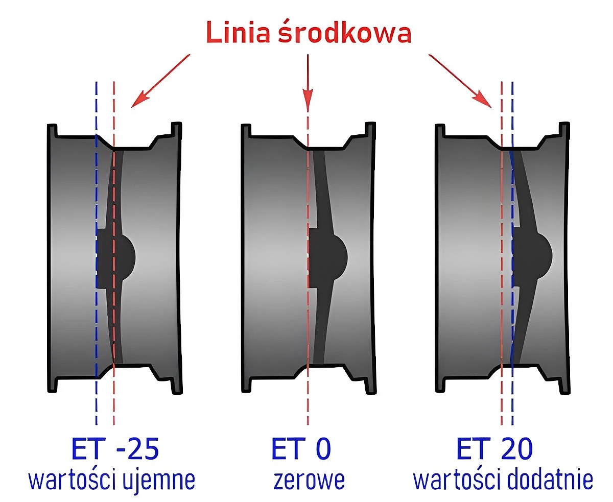 Mówiąc wprost: im mniejsze ET, tym mocniej wysunięte na zewnątrz jest koło. Koło z felgą ET 30 jest mocniej wysunięte niż to z ET 35, natomiast to z ET -15 jest mocniej wysunięte od tego z ET 30.