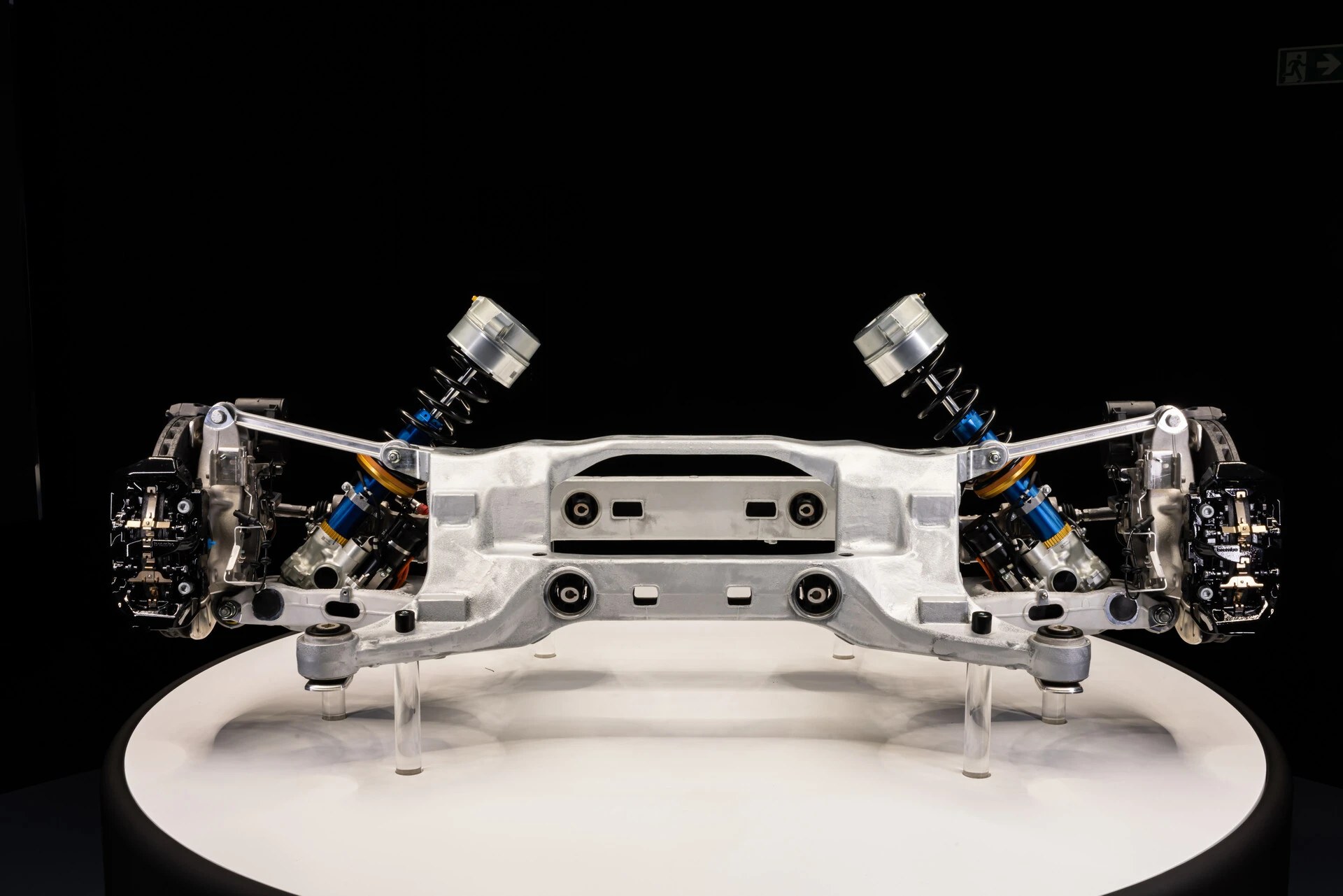 Po raz pierwszy w historii firmy użyto amortyzowanej ramy pomocniczej, która została zaprojektowana tak, żeby ograniczyć hałas i drgania w kabinie, ale przy zachowaniu sztywności i dynamiki prowadzenia. Dlaczego to ważne? W klasycznych Ferrari silnik spalinowy wytwarza trochę wibracji, które maskują wibracje pochodzące z zawieszenia. W Elettrica jest inaczej, więc trzeba było wyjść naprzeciw problemowi. Rama pomocnicza osadzona została na elastomerowych tulejach, które pochłaniają drgania i hałasy, ale jednocześnie nie odcinają kierowcy od bodźców przekazywanych przez tylne koła. Co ciekawe - ta rama jest największym jednolitym odlewem w historii firmy. Jeszcze bardziej zaskoczyło mnie, że firma zdecydowała się na łatwy dostęp do poszczególnych sekcji, co ułatwi w przyszłości obsługę serwisową.