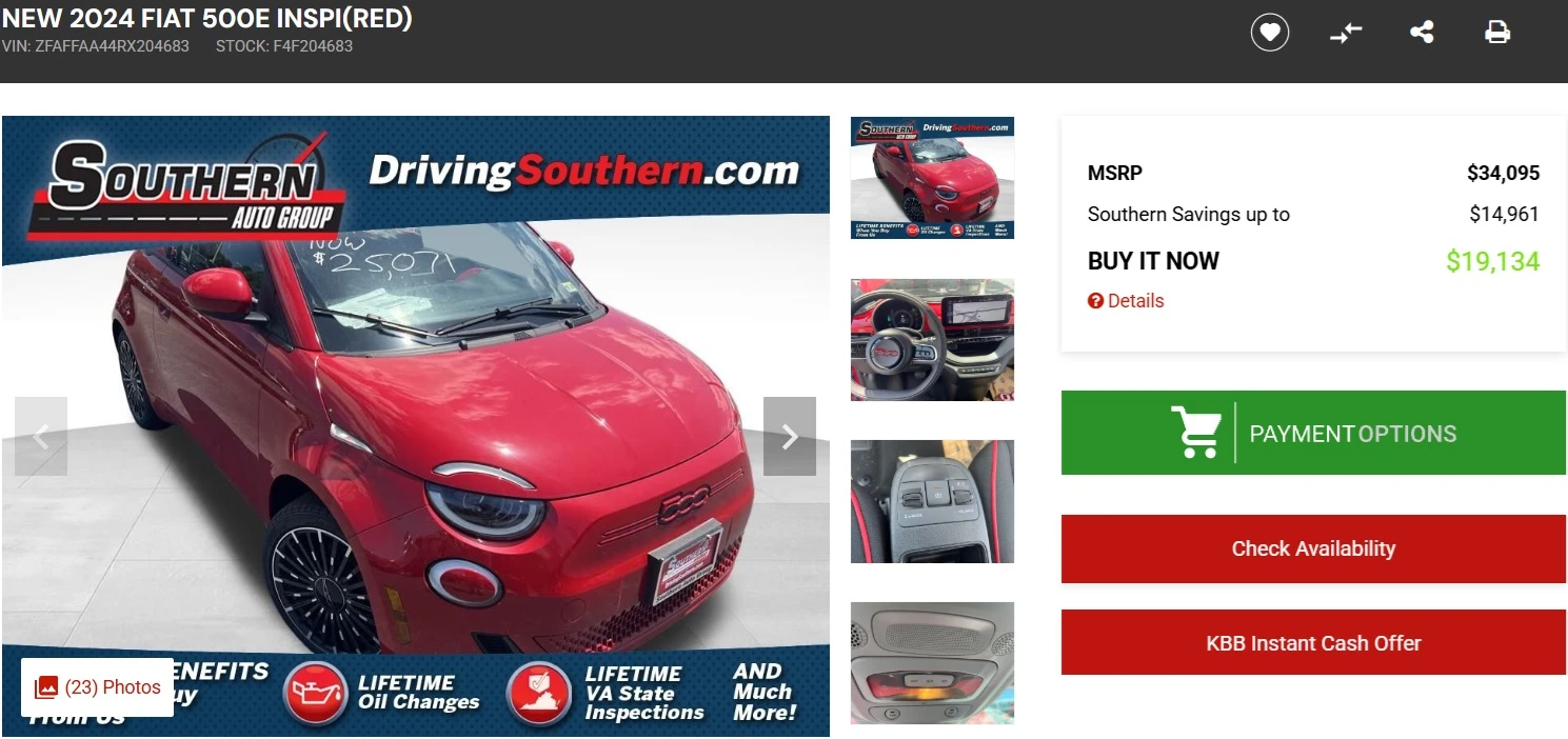Najtańszym jest najprawdopodobniej Fiat 500e INSPI(RED) z 2024 roku. W swojej ofercie ma go dealer Southern Dodge Chrysler Jeep Ram Fiat w Norfolk w stanie Wirginia, oferujący na niego ogromną zniżkę.
