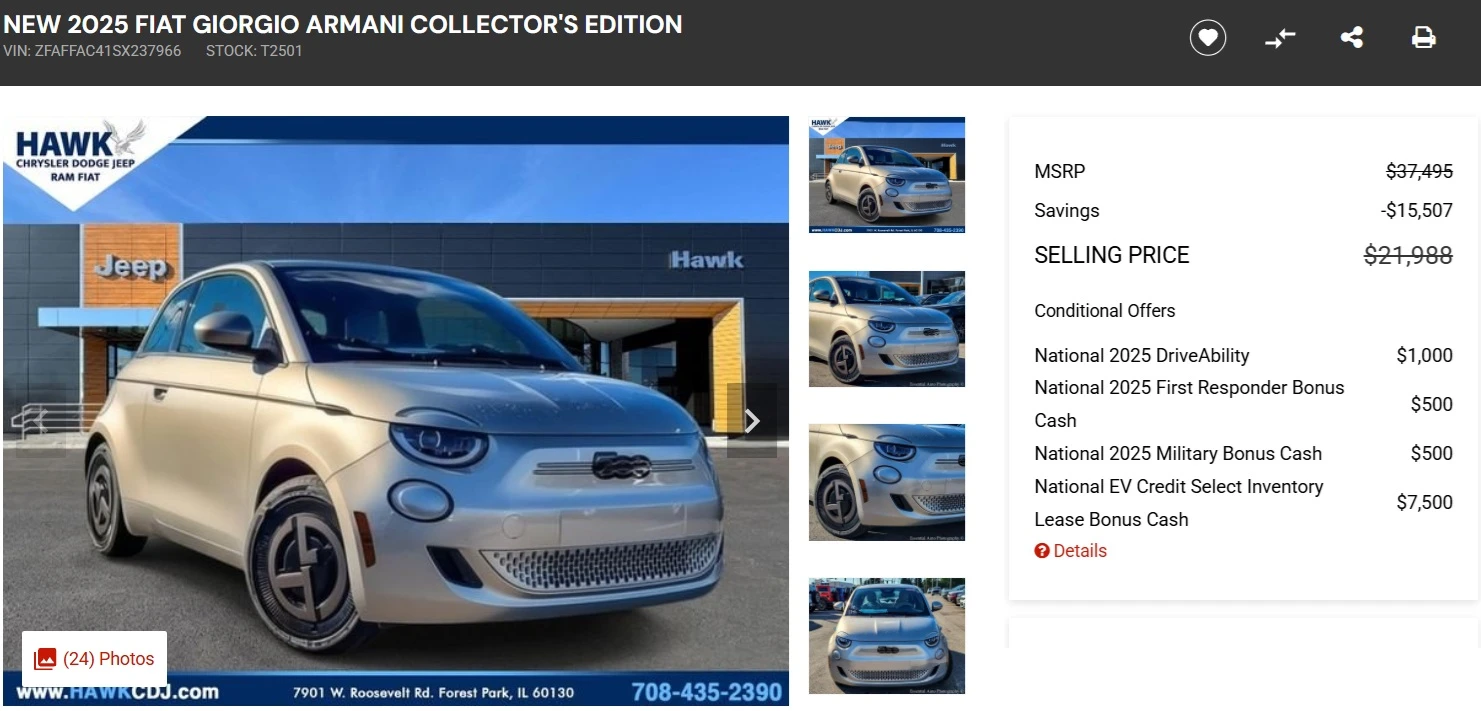 Jeżeli jednak ktoś z jakiegoś powodu pokręci nosem na nowe auto z 2024 roku, to znajdzie się też coś nowszego. Na przykład w salonie Hawk Chrysler Dodge Jeep Ram Fiat w Forest Park w stanie Illinois można kupić Fiata 500e w limitowanej edycji specjalnej Armani Edition z 2025 roku za 21 988 dol. (80 tys. zł). To o 15 507 dol. mniej niż pierwotna cena katalogowa 37 495 dol. Innym przykładem jest salon o nazwie Taverna Chrysler Dodge Jeep Ram Fiat rezydujący na Florydzie, który oferuje limitowaną wersję Armani Edition z rabatem 12 254 dol.