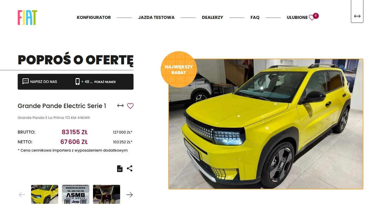 Na stronie internetowej Salon Fiat, zbierającej oferty dealerów marki, można znaleźć bowiem nowe egzemplarze Grande Pandy Electric, na widok których zaświecą wam się oczy. To dlatego, że mowa o najwyższej wersji wyposażenia La Prima. Największy rabat na taki samochód daje salon w Nowym Targu, to aż 43 845 zł. Wcześniej kosztował on 127 000 zł, ale jeśli się pospieszycie, dostaniecie go za 83 155 zł.