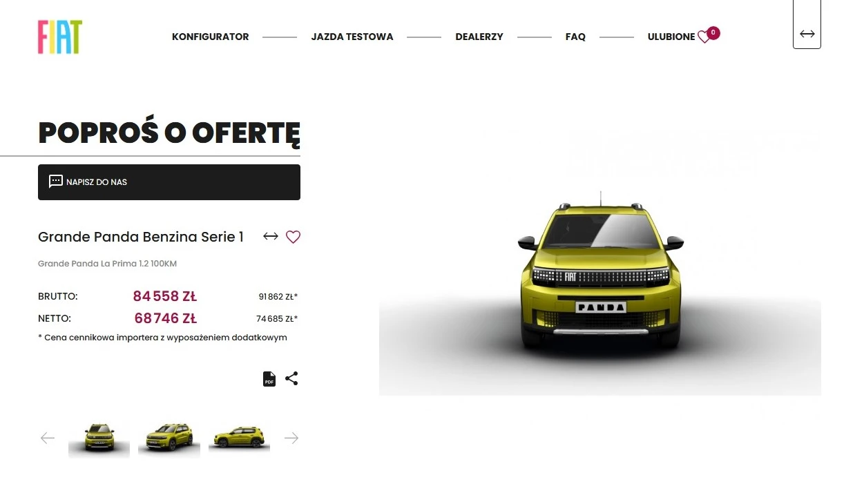 Jeśli mimo wszystko nie jesteście przekonani do elektrycznej Grande Pandy, w podobnych pieniądzach znajdziecie też egzemplarze z benzynowym 1.2 generującym 100 KM, ale w ich przypadku rabaty nie będą tak imponujące, bo ta odmiana kosztuje mniej już na starcie. Najtańszy spalinowy wariant w wersji wyposażenia La Prima to 84 558 zł, czyli oszczędność względem początkowych 91 862 zł to już nie tak spektakularne 7304 zł. Najważniejsze, że jest do wyboru i do koloru, więc nic tylko się rozejrzeć.