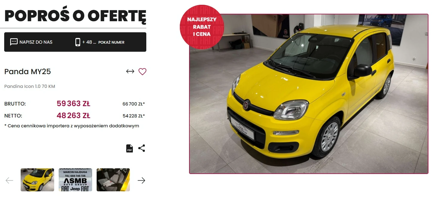Cena 59 636 zł oznacza de facto obniżkę o 7 tys. zł, a oferta pochodzi z salonu Nowego Targu. Można zatem pojechać na wyjazd w góry pociągiem, a wrócić z niego nową Pandą w atrakcyjnej cenie.
