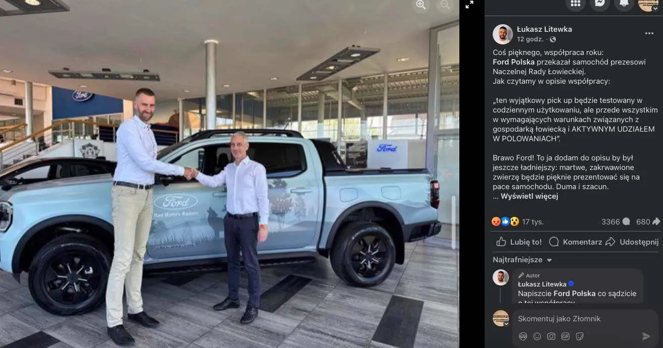 Z wezwaniem, aby „napisać firmie Ford Polska co sądzicie o tej współpracy”. Co sądzi Łukasz Litewka, nie trzeba zgadywać – w swoim komentarzu ujął on to tak: „martwe, zakrwawione zwierzę będzie pięknie prezentować się na pace samochodu. Duma i szacun." Oczywiście wezwanie zadziałało i wkrótce fanpage Ford Polska został zalany setkami wściekłych reakcji i komentarzy, napisanych pod zupełnie niewinnymi postami na inny temat, niemających nic wspólnego z polowaniami. Innymi słowy, za sprawą posła Litewki odbył się internetowy lincz.
