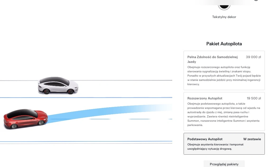 W standardzie dostaniemy Podstawowego Autopilota. Obejmuje on asystenta kierowania i tempomat uwzględniający sytuację drogową. Za 19 500 zł można dokupić Rozszerzonego Autopilota, z większym poziomem wsparcia. Auto będzie mogło na przykład zmienić samodzielnie pas ruchu na autostradzie. Jest także nawigowanie na Autopilocie, czy automatyczne parkowanie.