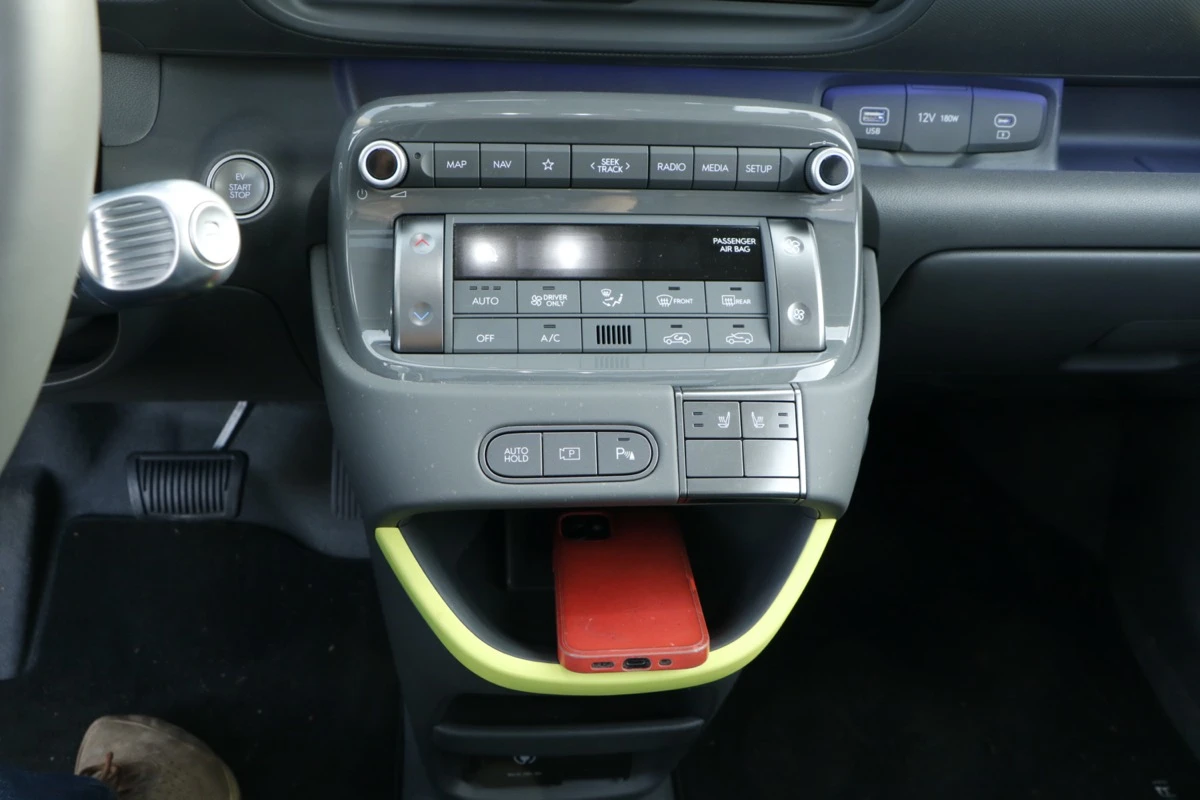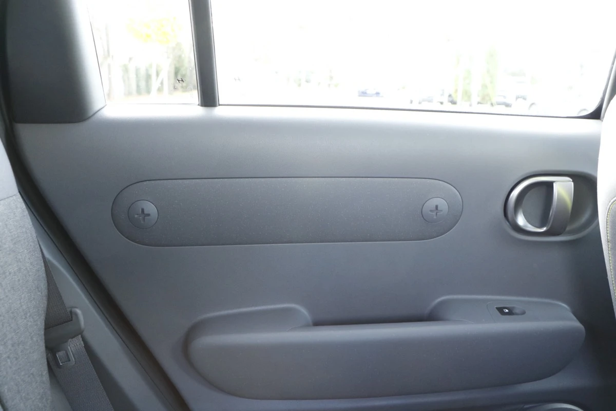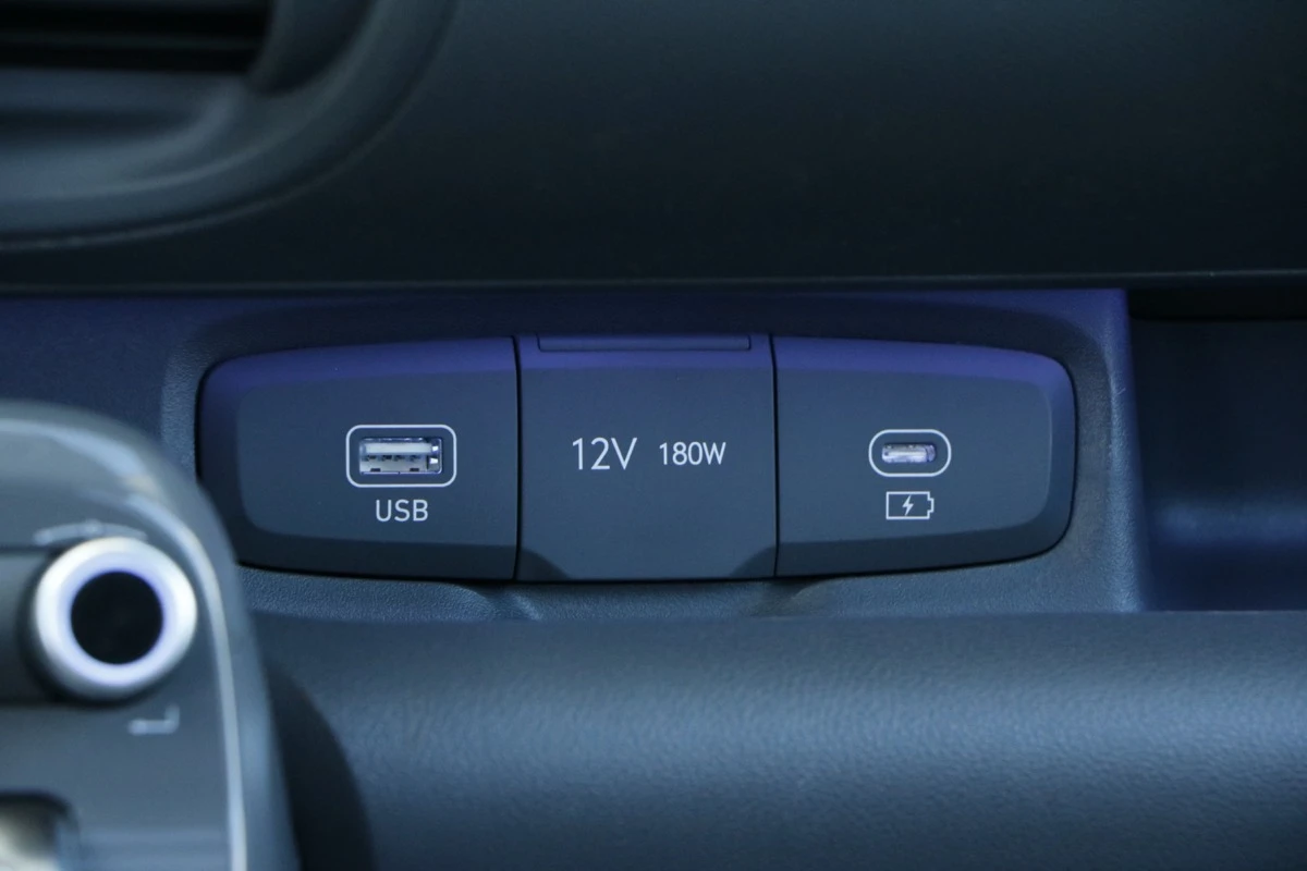 Poniżej tablicy przyrządów znajdziemy w Insterze gniazdko prądu przemiennego 230 V. Jest ono opcjonalne i pojawia się dopiero w wersji Smart. Ciekawe, że dołączono również przejściówkę V2L do gniazda ładowania umieszczonego z przodu samochodu. Dużo wirtualnych punktów przyznaję za prosty panel z trzema gniazdami: USB-A, 12 V i USB-C. Jest to rodzaj przemyślanego elementu, który idealnie pasuje do Instera – w innych samochodach często się to ukrywa, jako wizualnie wątpliwe. Inster ma charakter skrzynki z narzędziami, auta nie silącego się na elegancję i premium. Stąd i dużo półeczek, i te śmieszne odkręcane elementy na drzwiach, mocowane na wielkie, plastikowe spinko-śruby. Można je w ogóle zastąpić np. uchwytem na karty, jest w katalogu akcesoriów za ponad 500 zł. Albo haczyki w podłokietnikach z boku – też fajne, na torbę z zakupami.