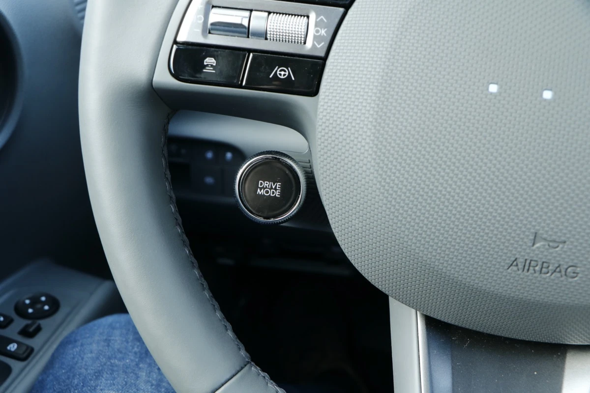 Trochę zaskoczyła mnie obecność zaślepek na konsoli środkowej w najbogatszej wersji – naprawdę można było to pominąć. Jednak doceniam obecność fizycznych przycisków, trochę w stylu lat 90. Tyle że taka wersja sterowania radiem czy klimatyzacją jest po prostu najwygodniejsza. Ciekawe też, że Hyundai zrezygnował z umieszczenia logo na kierownicy i zamiast niego w tej wersji (ale nie we wszystkich) mamy małe LEDy, zmieniające kolor w zależności np. od kierunku jazdy.