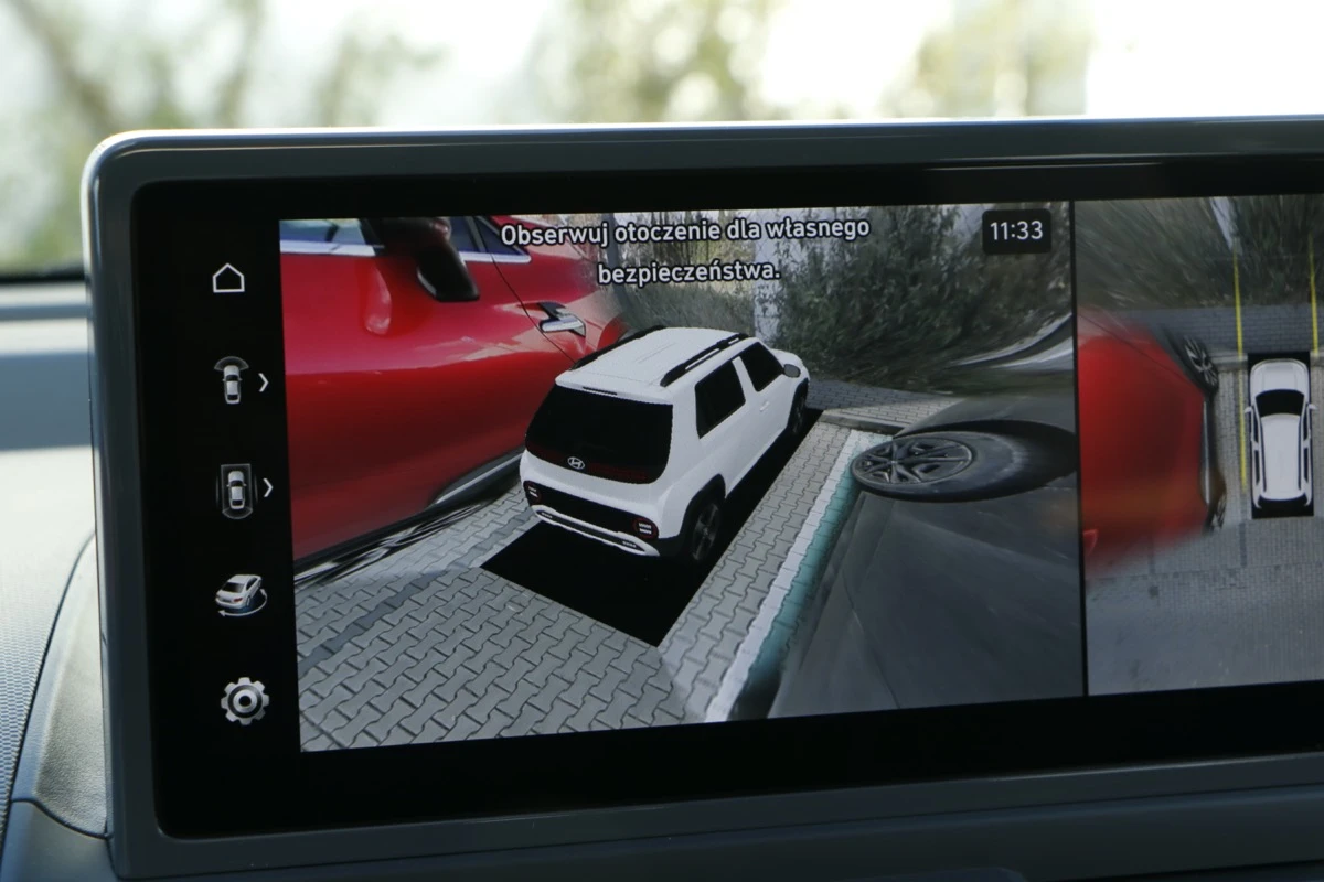 Inster przekonuje też przyjemnym widokiem do przodu, gdzie maska silnika jest idealnie widoczna, jak w starych samochodach. O widok do tyłu martwić się nie trzeba, ponieważ kamera cofania – seryjna w testowanej wersji – oferuje obraz wysokiej jakości. Po moich niedawnych doświadczeniach z Renault i Dacią czułem się jakbym oglądał obraz w rozdzielczości 8K. Od razu jednak zauważę, że widok „540 stopni” pokazujący samochód niby z zewnątrz to zbyteczny gadżet, ponieważ zniekształca otoczenie do stopnia uniemożliwiającego ocenę odległości. Samo manewrowanie Insterem nie jest trudne, jednak warto pamiętać, że średnica zawracania to aż 10,6 metra. Trochę dużo jak na taki samochód.
