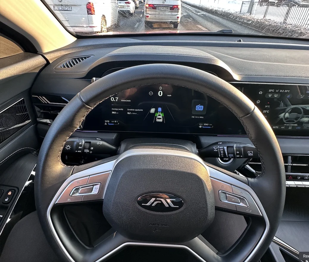Egzemplarz JAC JS8 Pro chyba nie przeszedł przez normalny europejski proces homologacyjny. Nie dostrzegam tu systemu utrzymywania w pasie ruchu, a przede wszystkim nie ma ostrzeżeń o przekroczeniu prędkości i w ogóle te wartości nie są podawane. Jest za to aktywny tempomat, czyli auto samodzielnie utrzymuje odległość od poprzedzającego pojazdu. To nic niezwykłego.
