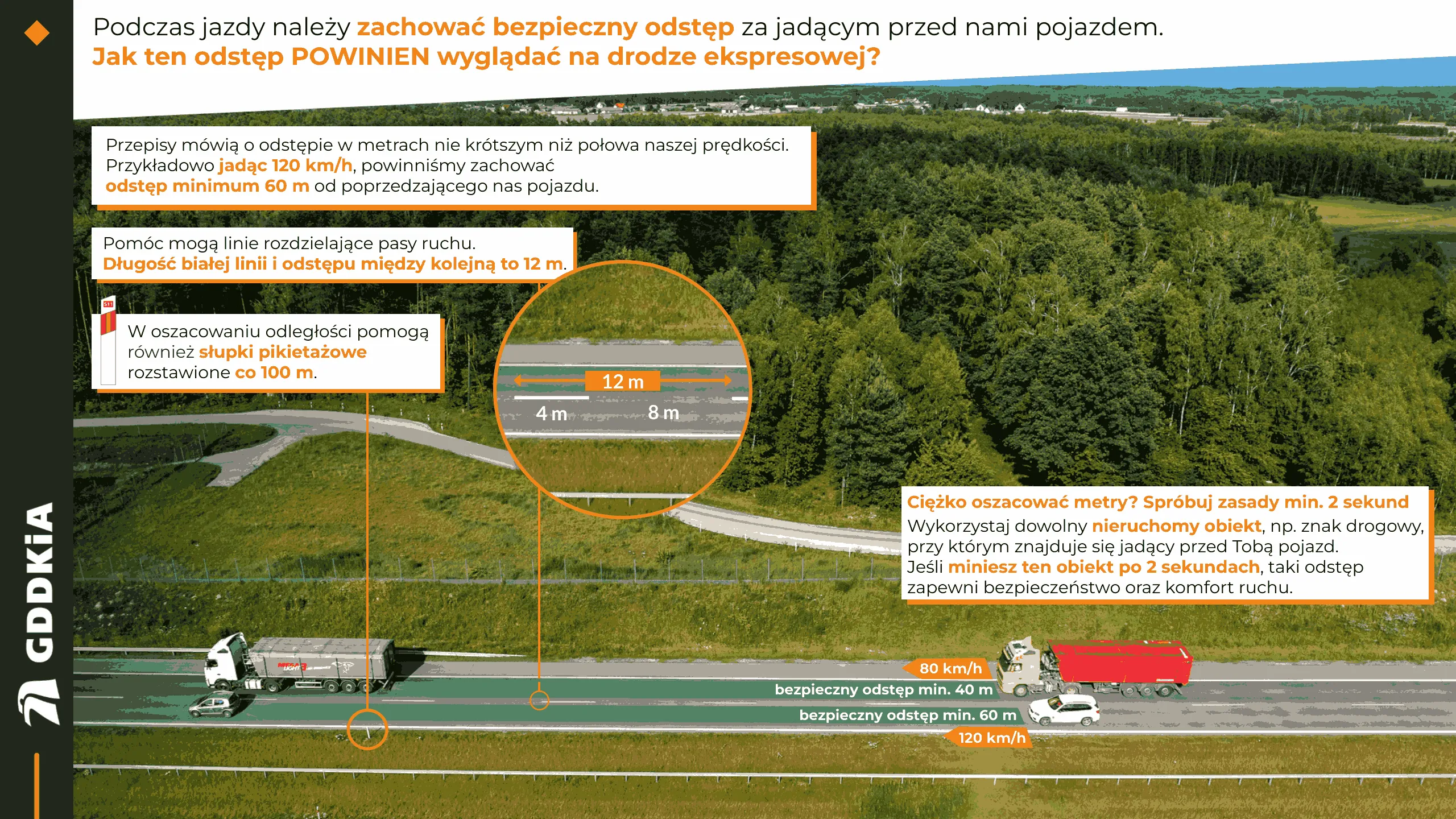Władze doradzają nam tu na różne sposoby. Radzą obserwować elementy infrastruktury drogowej i odliczać 2 sekundy. Albo posługiwać się słupkami pikietażowymi, które rozstawione są co 100 m. Można też liczyć linie rozdzielające pasy ruchu. Długość białej linii i odstępu między liniami to 12 m.