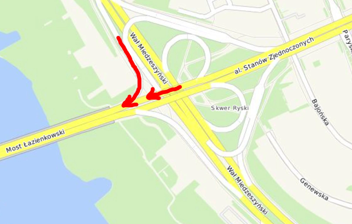 Pozornie, nie ma tutaj zupełnie nic niezwykłego. Na mapie satelitarnej wszystko wygląda normalnie, podobnie jak w pozostałych miejscach Trasy Łazienkowskiej w obrębie mostu na Wiśle.