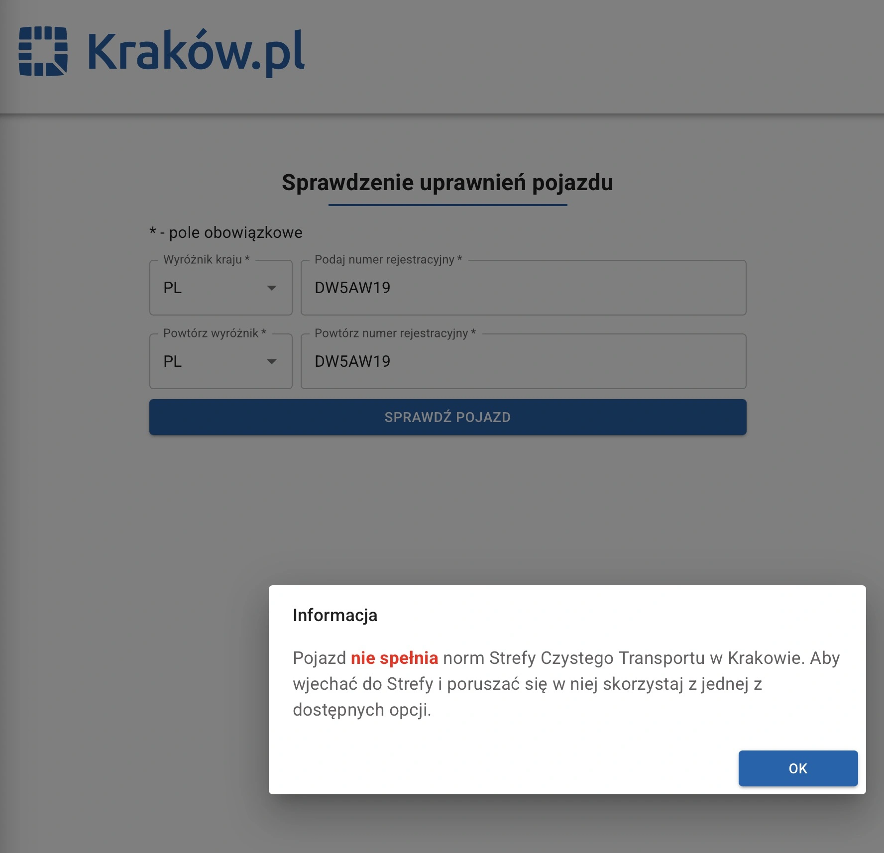 Można też zajrzeć do przeglądarkowej aplikacji miasta Kraków, gdzie samo wpisanie numerów rejestracyjnych zwróci nam prostą informację - możemy wjeżdżać bez problemu albo problemy będą.