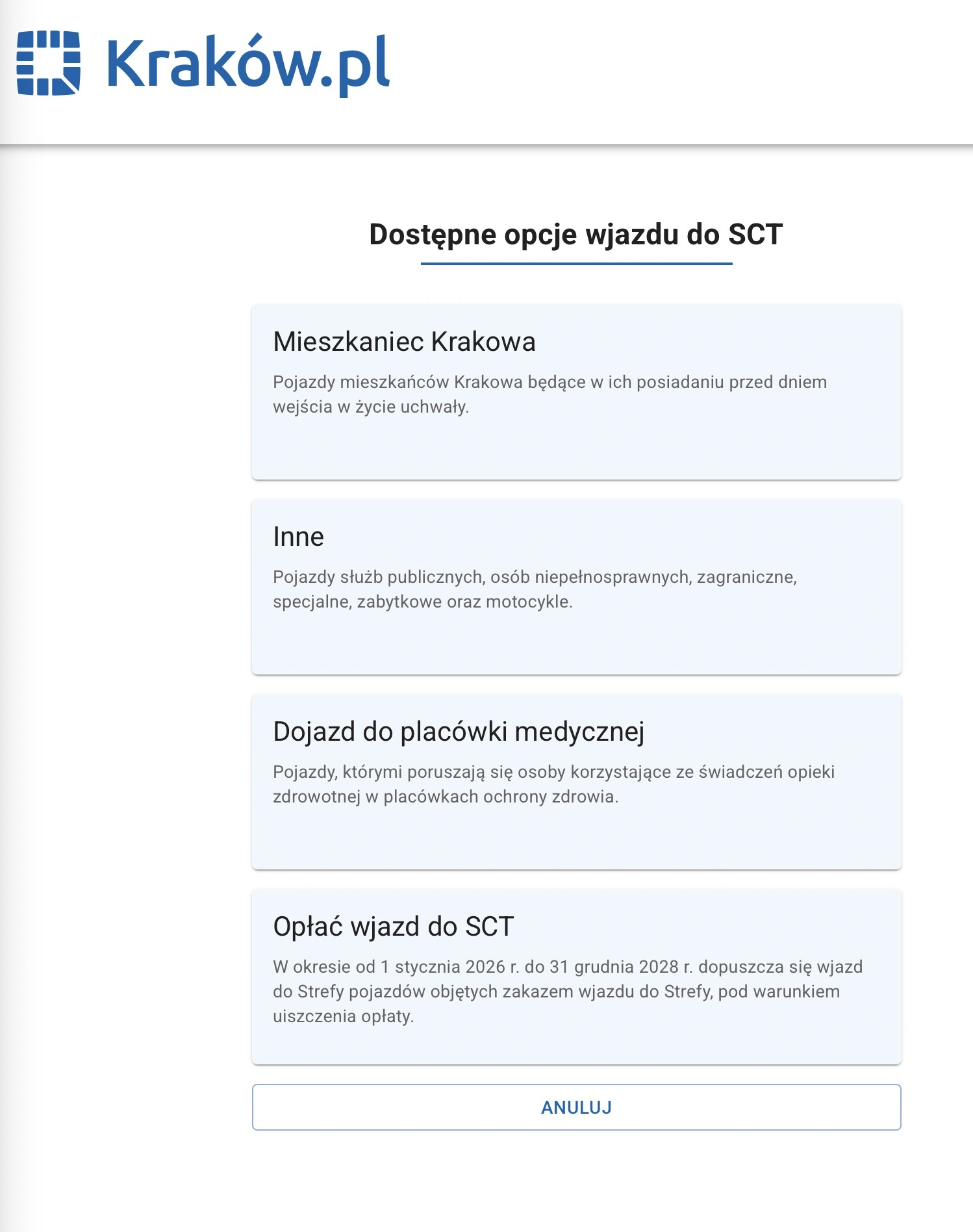 Jeśli nasz wyjazd ma charakter "po prostu wyjazdu", a nie podróży do placówki medycznej, musimy niestety pogodzić się z koniecznością uiszczenia opłaty za wjazd. W przypadku skorzystania ze wspomnianej wcześniej aplikacji przeglądarkowej, od razu dostaniemy odpowiednią listę opcji: