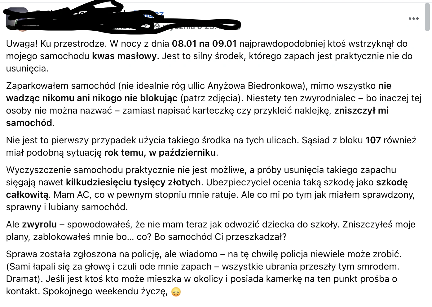 Co dalej? Jeżeli wasz samochód będzie obiektem takiego ataku, to niezwłocznie powiadomcie policję, bo to akt wandalizmu. Módlcie się o sprawny monitoring w okolicy, a jak nie, to macie poważny problem. Zapach wnika w tapicerkę, plastiki, wygłuszenie i jest ekstremalnie trudny do usunięcia. Zwykłe ozonowanie nie pomaga, są na rynku firmy, które specjalizują się w usuwaniu tego zapachu, ale nawet one nie są w stanie zagwarantować 100-procentowej gwarancji powodzenia. Najczęściej niestety kończy się to złomowaniem samochodu, bo koszty przywrócenia do stanu sprzed ataku mogą sięgać kilkudziesięciu tysięcy złotych. Współczujemy autorowi posta i potępiamy takie ataki. Nie da się tego zakwalifikować pod naukę prawidłowego parkowania.