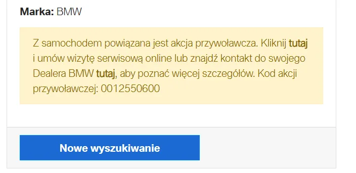 Wystarczy wejść na stronę BMW, którą znajdziecie pod tym linkiem. Tam wpisujecie swój numer VIN i jeżeli znajdziecie taki komunikat, to pędźcie do serwisu: