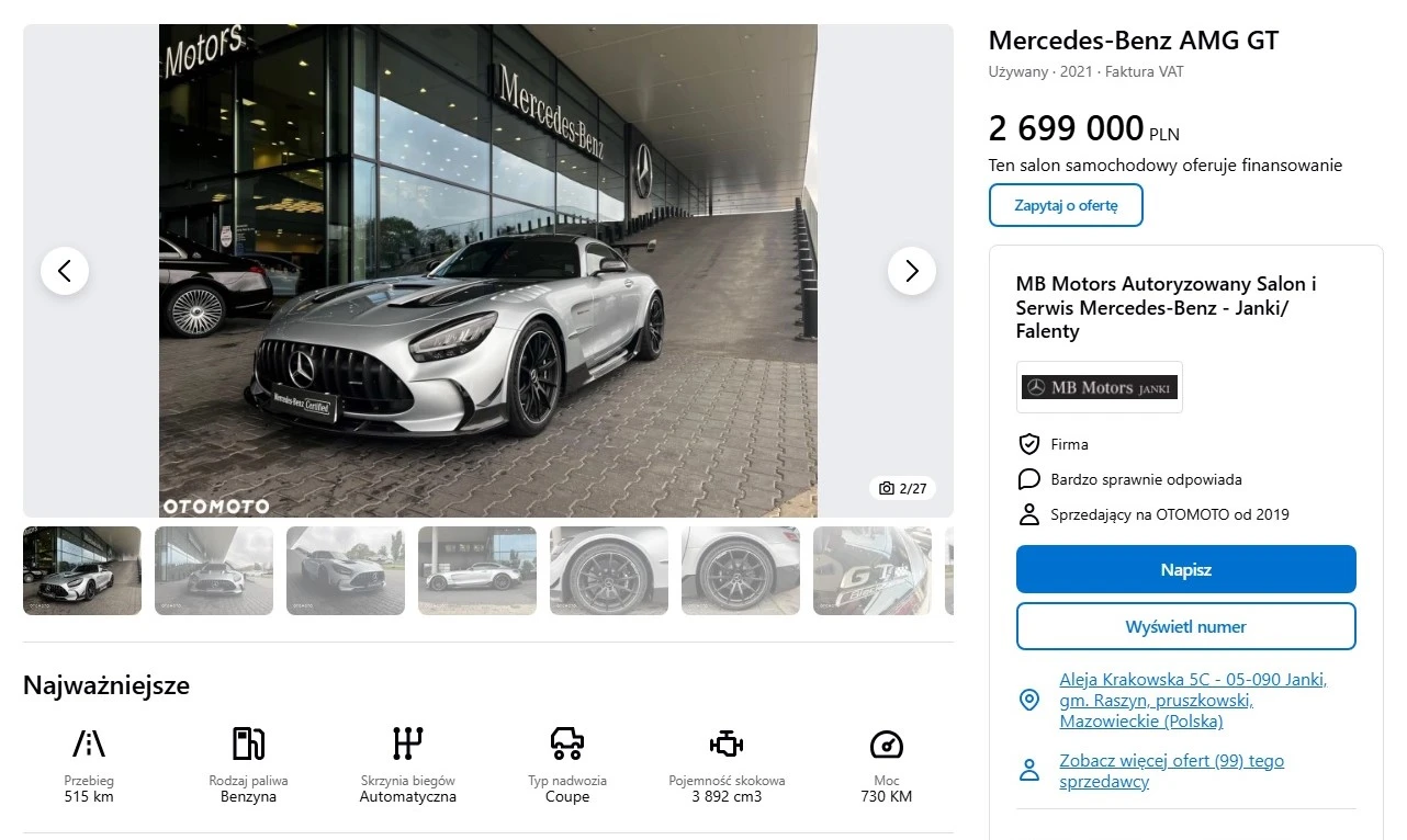 Za 2 699 000 zł teoretycznie można by oczekiwać masy bajerów, ale biorąc pod uwagę, że mówimy o sportowym coupe, płacimy więcej za mniej. Ma być lekko, agresywnie i bez zbędnych udziwnień. Szkoda jednak, że na ekranie systemu multimedialnego zamiast modelu GT Black Series wyświetla się GT R. Teoretycznie to nic nie znaczący detal, ale wprowadziłby trochę więcej poczucia wyjątkowości. Co ciekawe, nie jest to jedyne ogłoszenie dotyczące GT Black Seriesa. Za inny egzemplarz zapłacicie 1 840 000 zł – jeśli nie przeszkadza wam, że jego przebieg to prawie 6000 km. Którego z tej trójki byście wybrali i dlaczego?