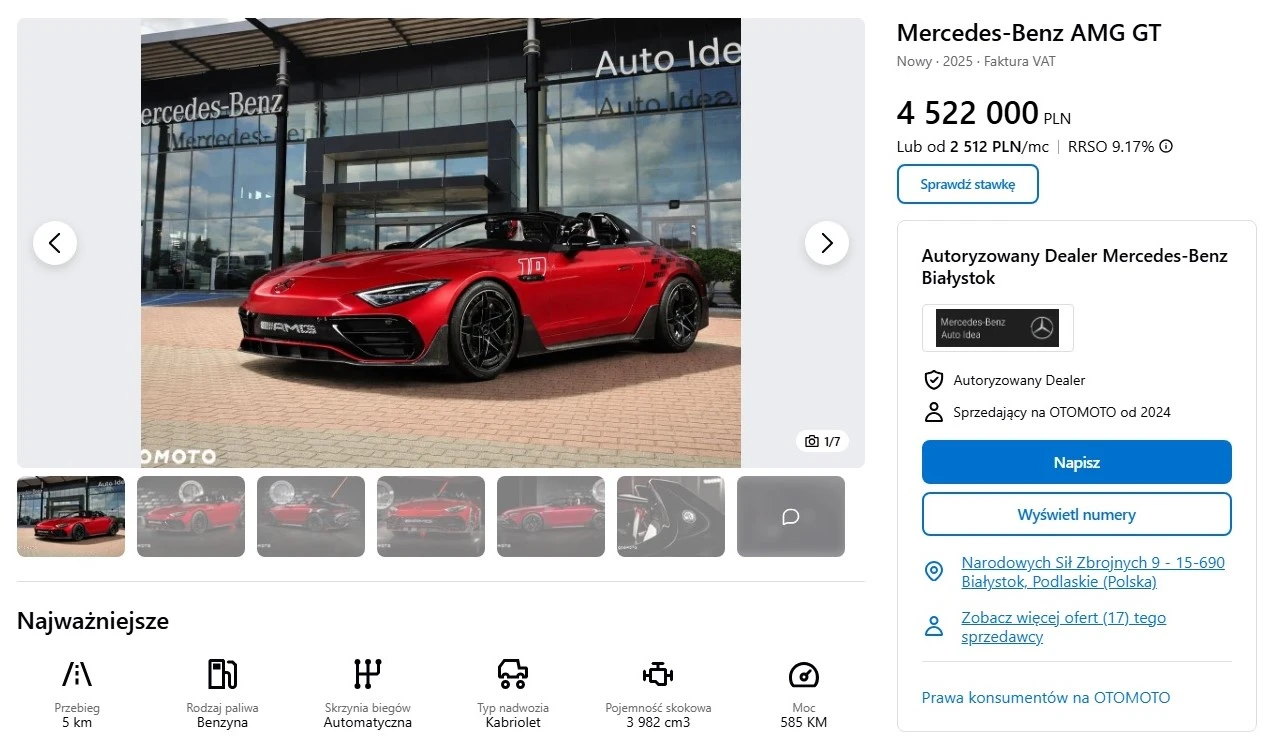 Salon w województwie podlaskim wystawił ten samochód za zawrotne… 4 522 000 zł. W tej cenie moglibyście kupić sobie cztery egzemplarze SL 63 za 1 061 000 zł, a za 278 000 zł, które wam zostaną dobrać do tego nową Mazdę MX-5 albo Audi A6. Brzmi to abstrakcyjnie, ale może macie jeszcze trochę oszczędności z komunii. Jeśli PureSpeed chodzi wam po głowie, dodam tylko, że dostawę do Polski planuje się na drugi kwartał, a realny odbiór dopiero na czerwiec tego roku.