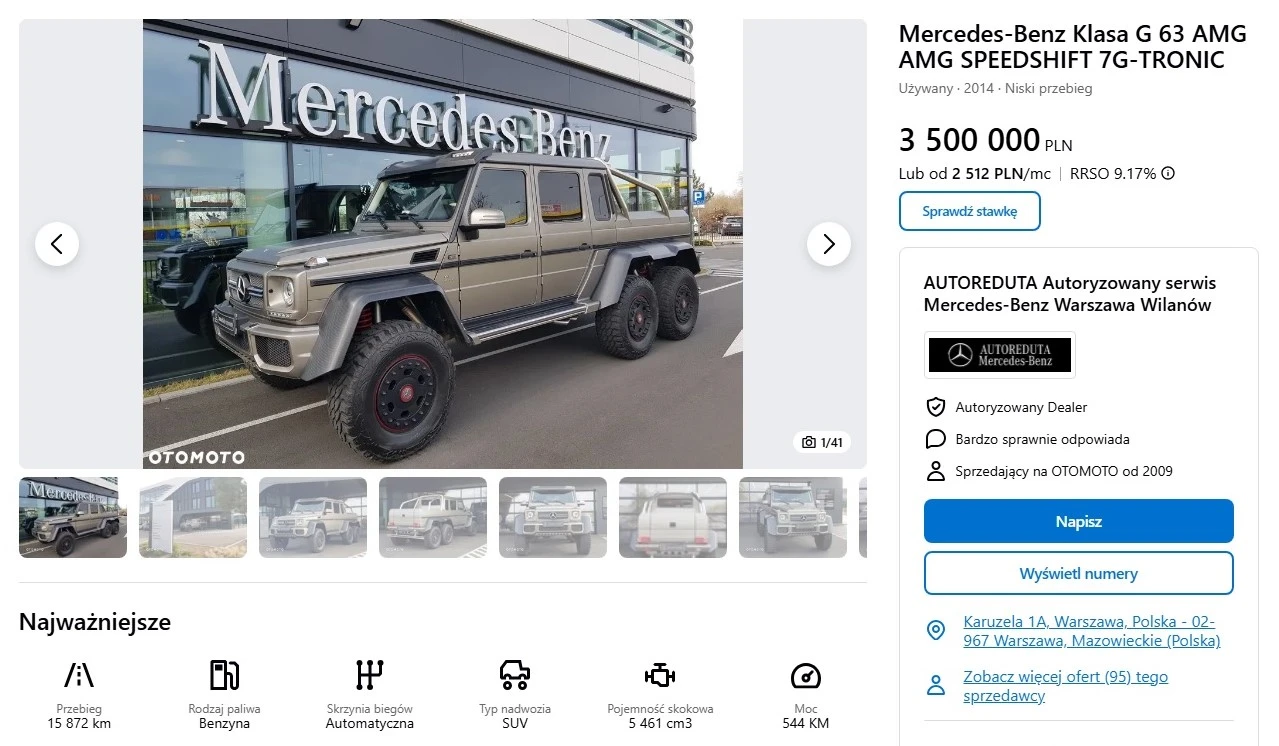 Trudno nie zgodzić się, że 4 522 000 zł to góra pieniędzy, dlatego warto poszukać też czegoś tańszego. Drugim najdroższym, ale jednocześnie bardziej przystępnym Mercedesem jest G 63 6x6 z 2014 roku. Terenowa ciężarówka ma 15 872 km przebiegu, ale w końcu mówimy o używanym pojeździe. Moc jest równie przyzwoita, bo pod maską znajdziecie 5,5-litrowe V8 generujące 544 KM.