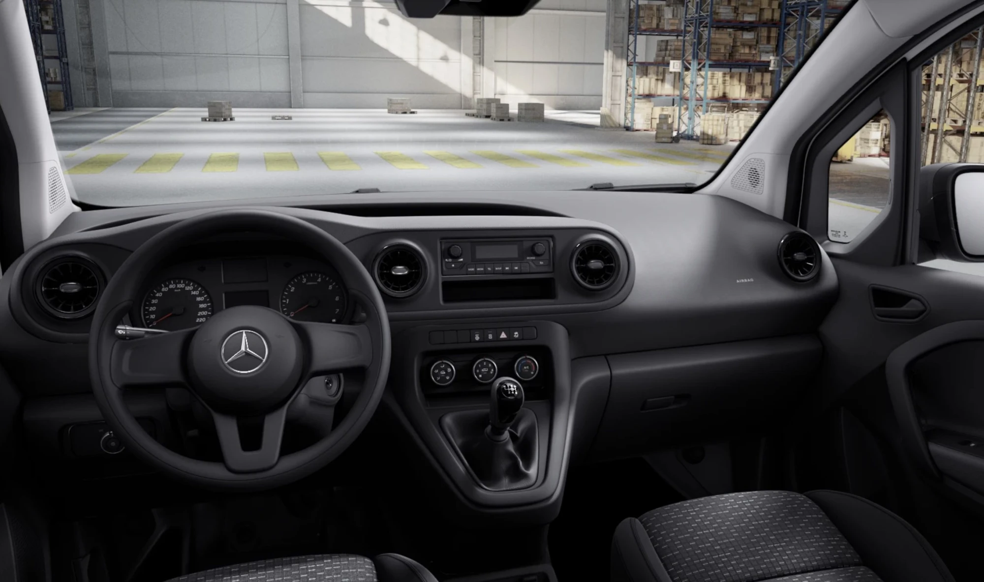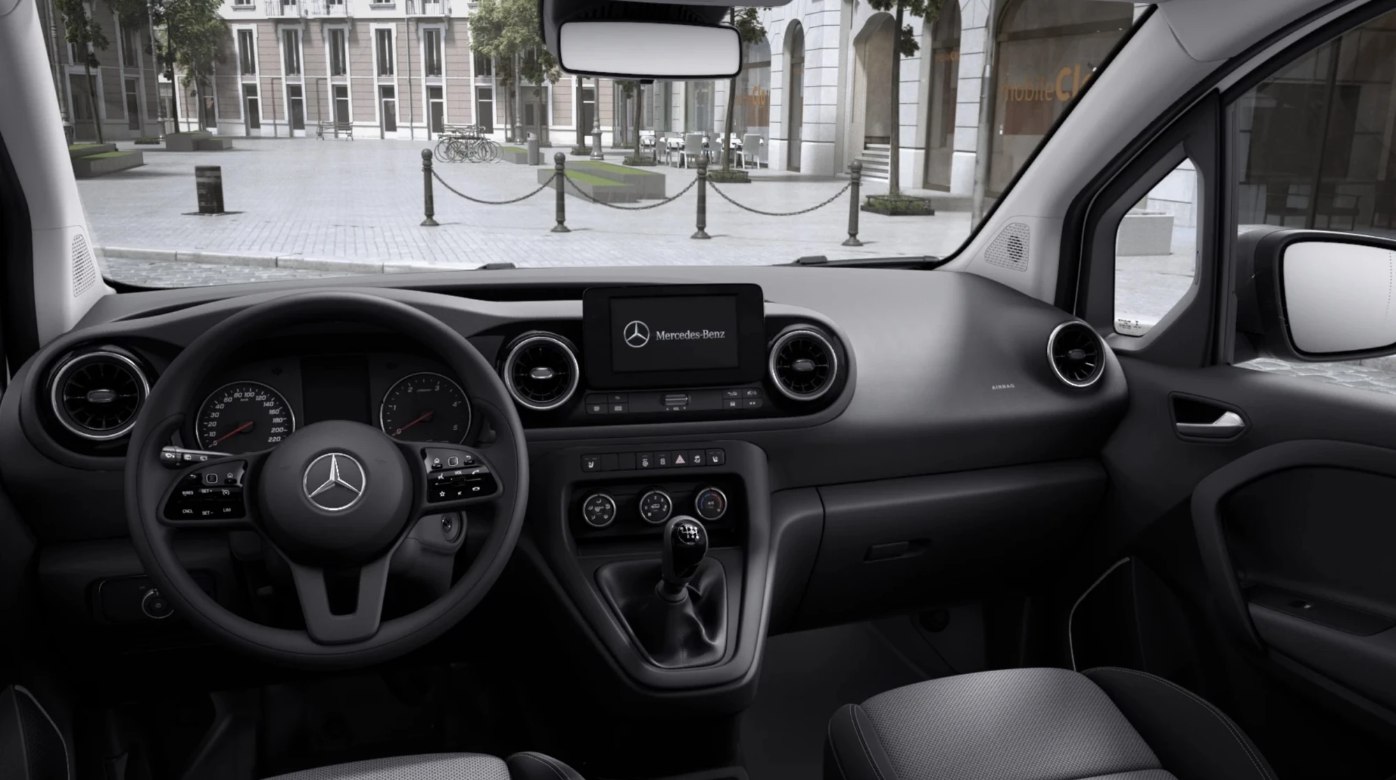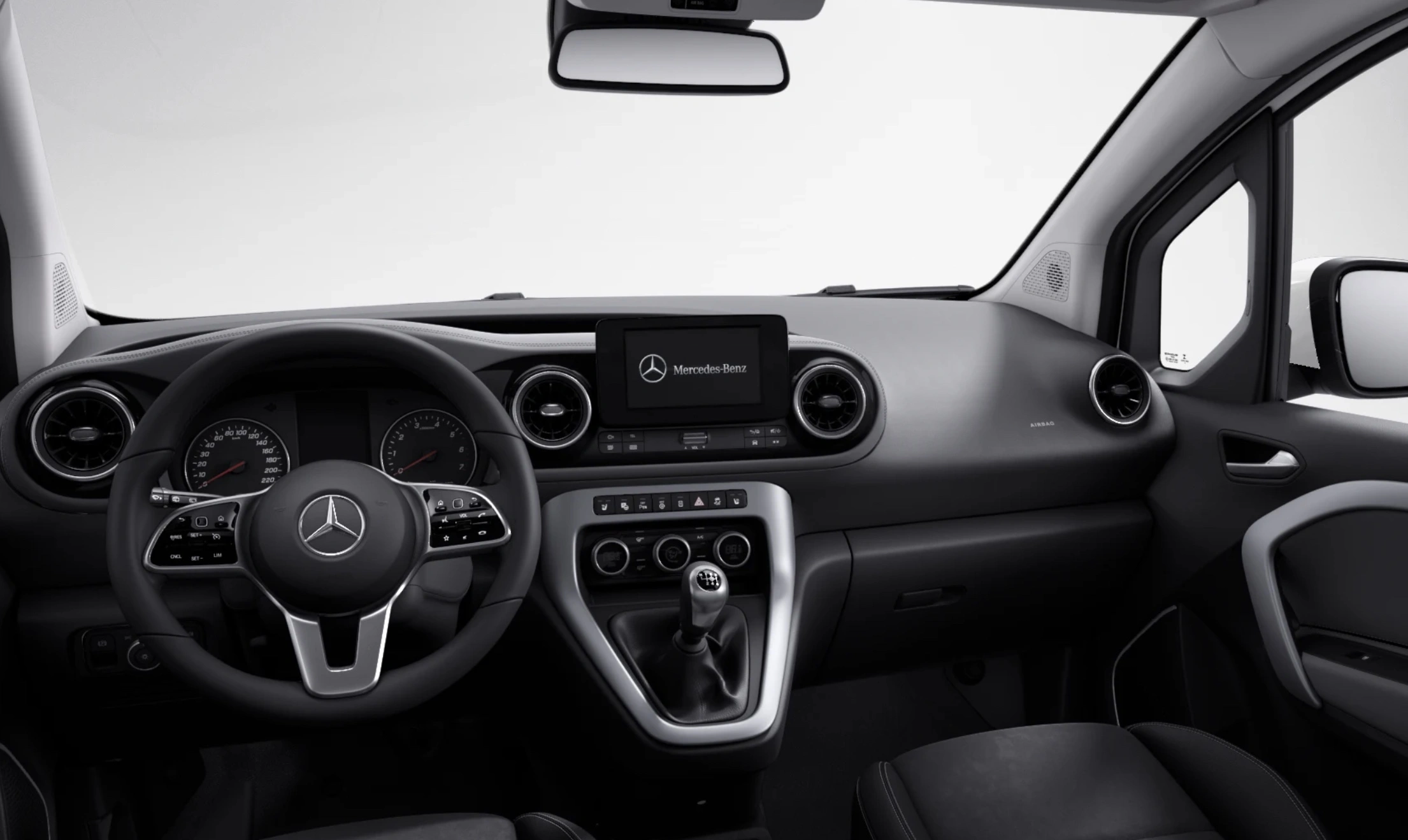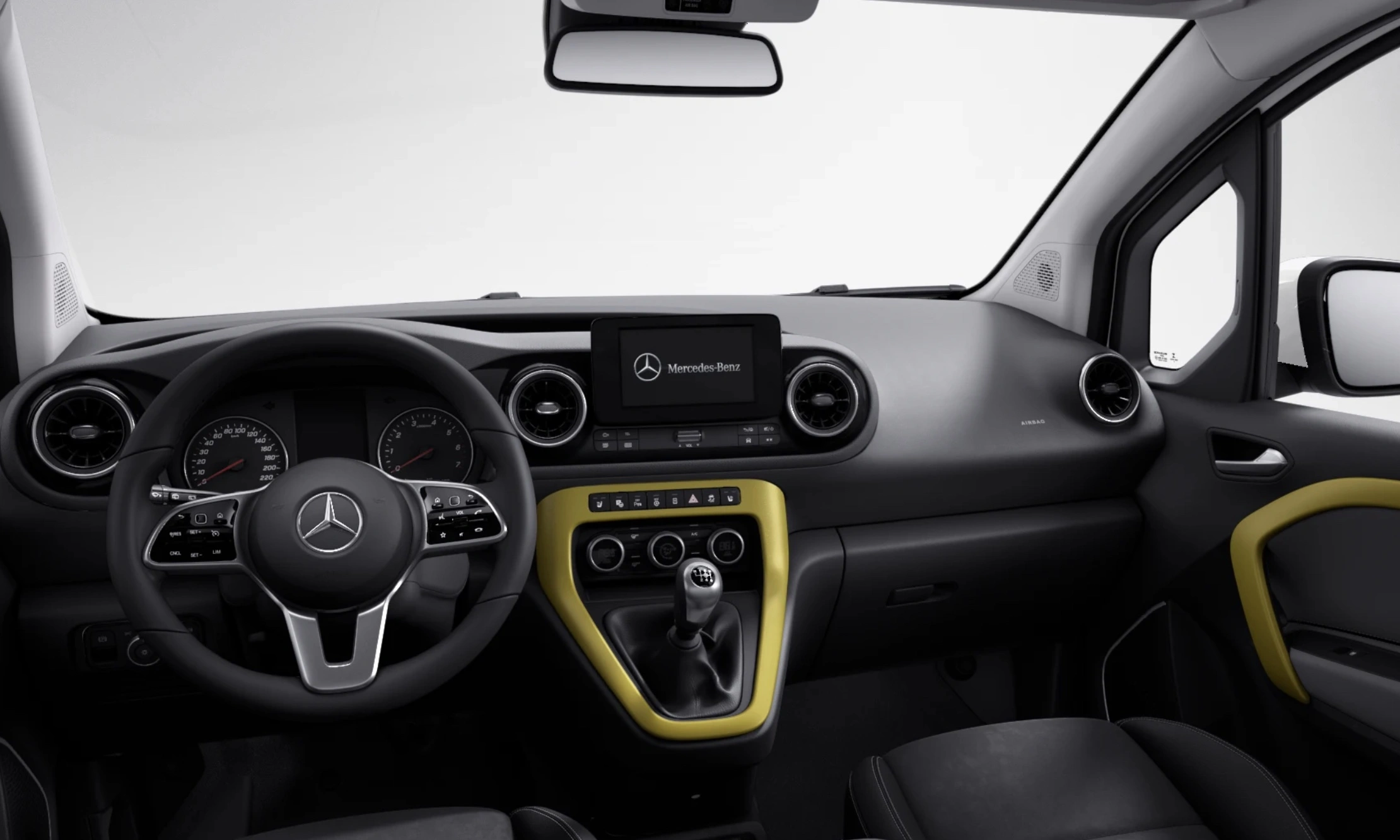W Citanie nie znajdziemy też kierownicy obszytej skórą nappa (opcja w klasie T), rozbudowanego pakietu Premium, całego pakietu asystentów jazdy, chromowanych akcentów na nadwoziu i kolorowych elementów dekoracyjnych we wnętrzu. Możliwe, że coś przegapiłem w mercedesowskim gąszczu opcji, ale ostatecznie wygląda na to, że Citan od klasy T różni się głównie tym, że można ten drugi model skonfigurować tak, żeby w środku prezentował się następująco: