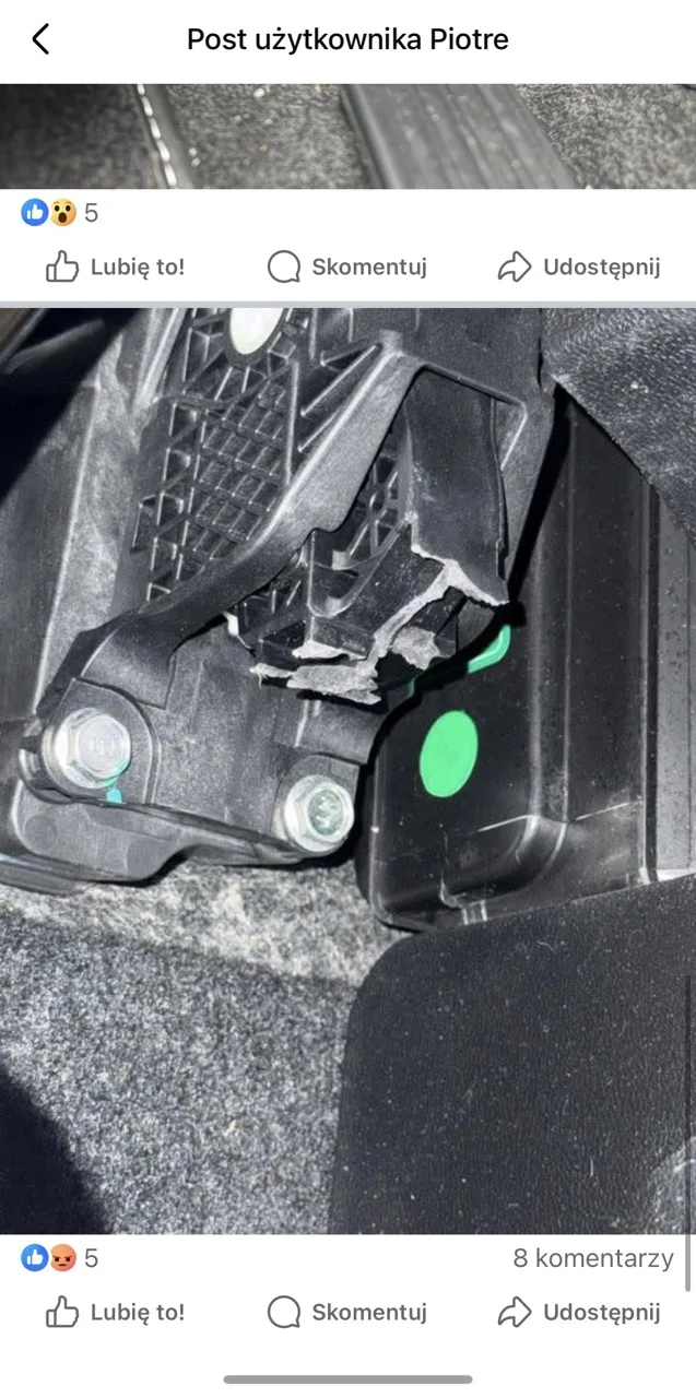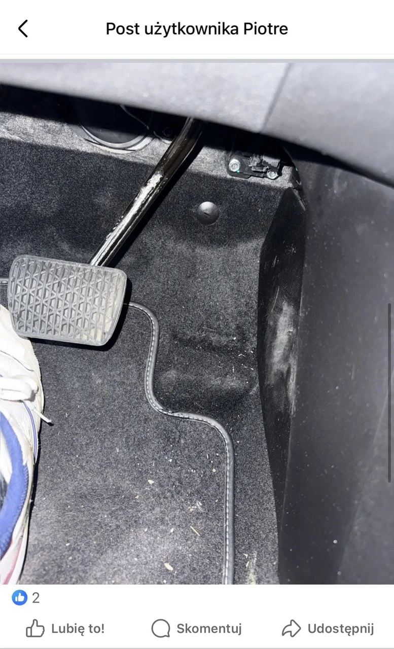 Post nie zawiera żadnych informacji: jaki to dokładnie model auta, jaki ma przebieg, co dokładnie się stało, czy pedał gazu odpadł w czasie jazdy, czy został np. w ręce podczas czyszczenia wnętrza czy prób wykonywania jakichś modyfikacji. Jedyny, lakoniczny opis to „Ups”.