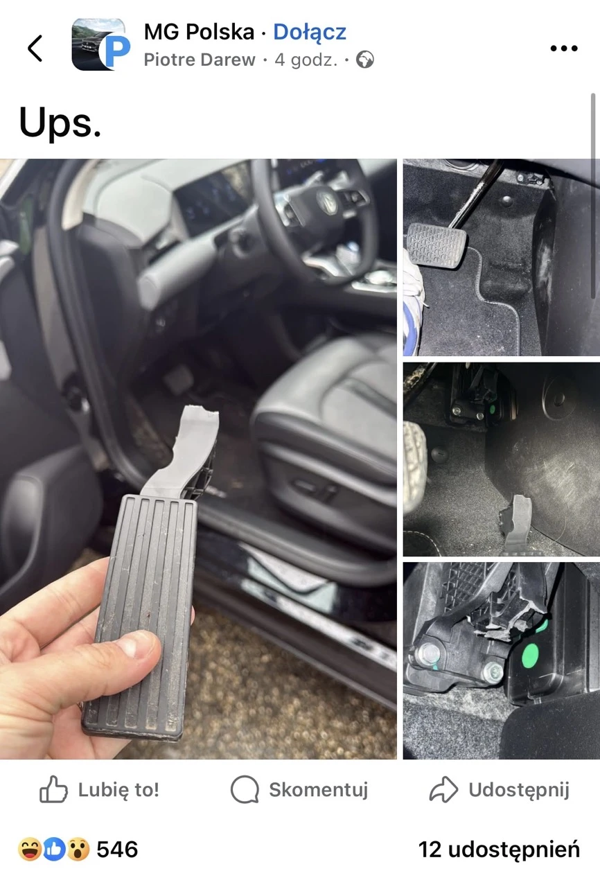 Na facebookowej grupie MG Polska można znaleźć post, którego autor pokazuje, co stało się z pedałem gazu w jego (?) aucie tej chińskiej marki z brytyjską nazwą.