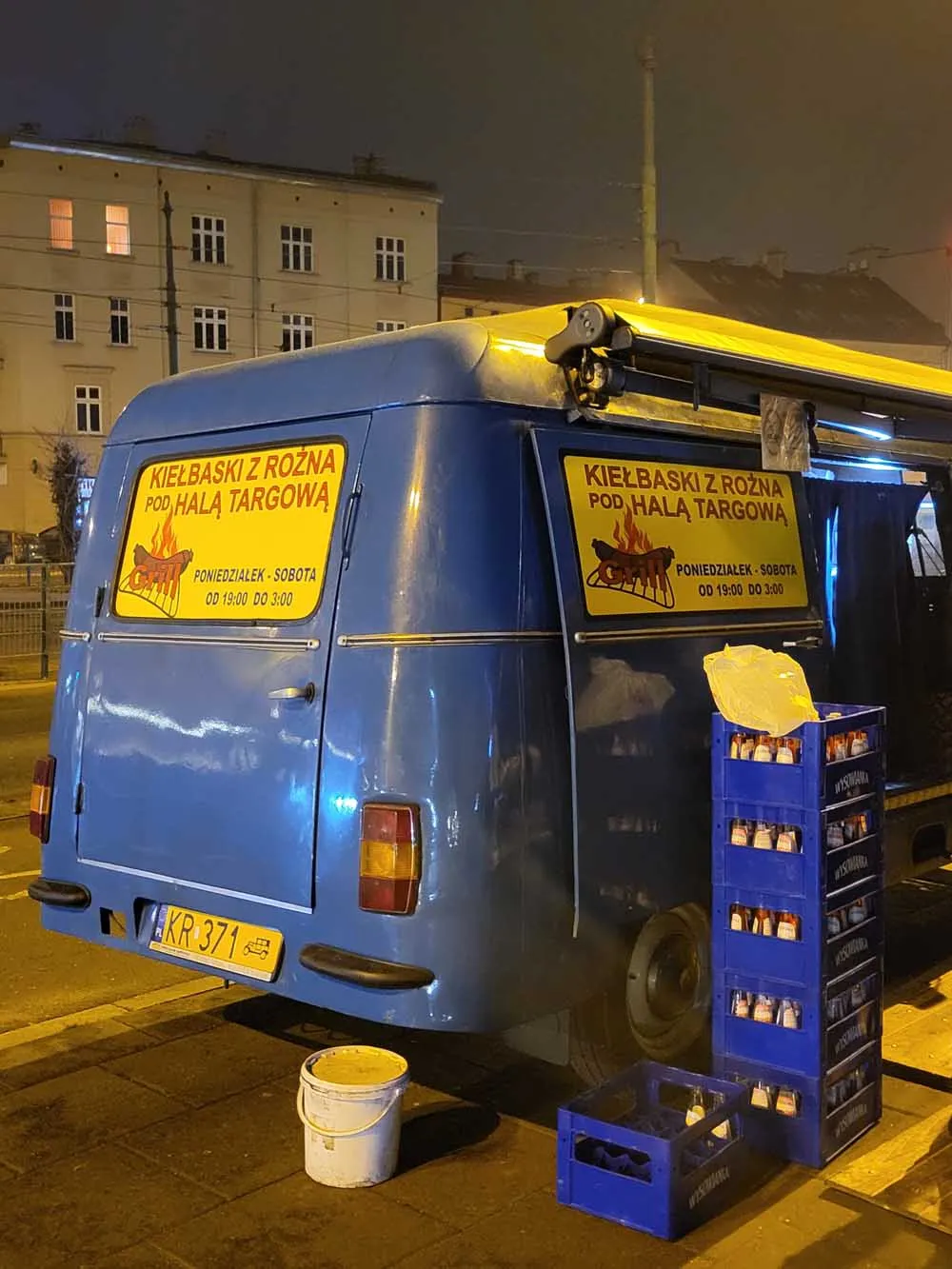Każdego dnia po południu, za wyjątkiem dni świątecznych, na chodniku obok Hali Targowej na ulicy Grzegórzeckiej parkuje niebieska Nysa. Punktualnie o godzinie 19 z boku otwierają się przesuwne drzwi, a ze środka wyjeżdża opalany drewnem ruszt. Jest to typowo nocny lokal, który operuje pomiędzy wspomnianą godziną 19.00 a godziną 3.00 dnia następnego. Asortyment pozornie wydaje się dosyć sztampowy, czyli kiełbasa z ognia, bułka, ogórek, oranżada albo coś ciepłego w postaci kawy lub herbaty. Sztampowy wszakże tylko dla tych, którzy nie znają historii niebieskiej Nysy w tym miejscu.