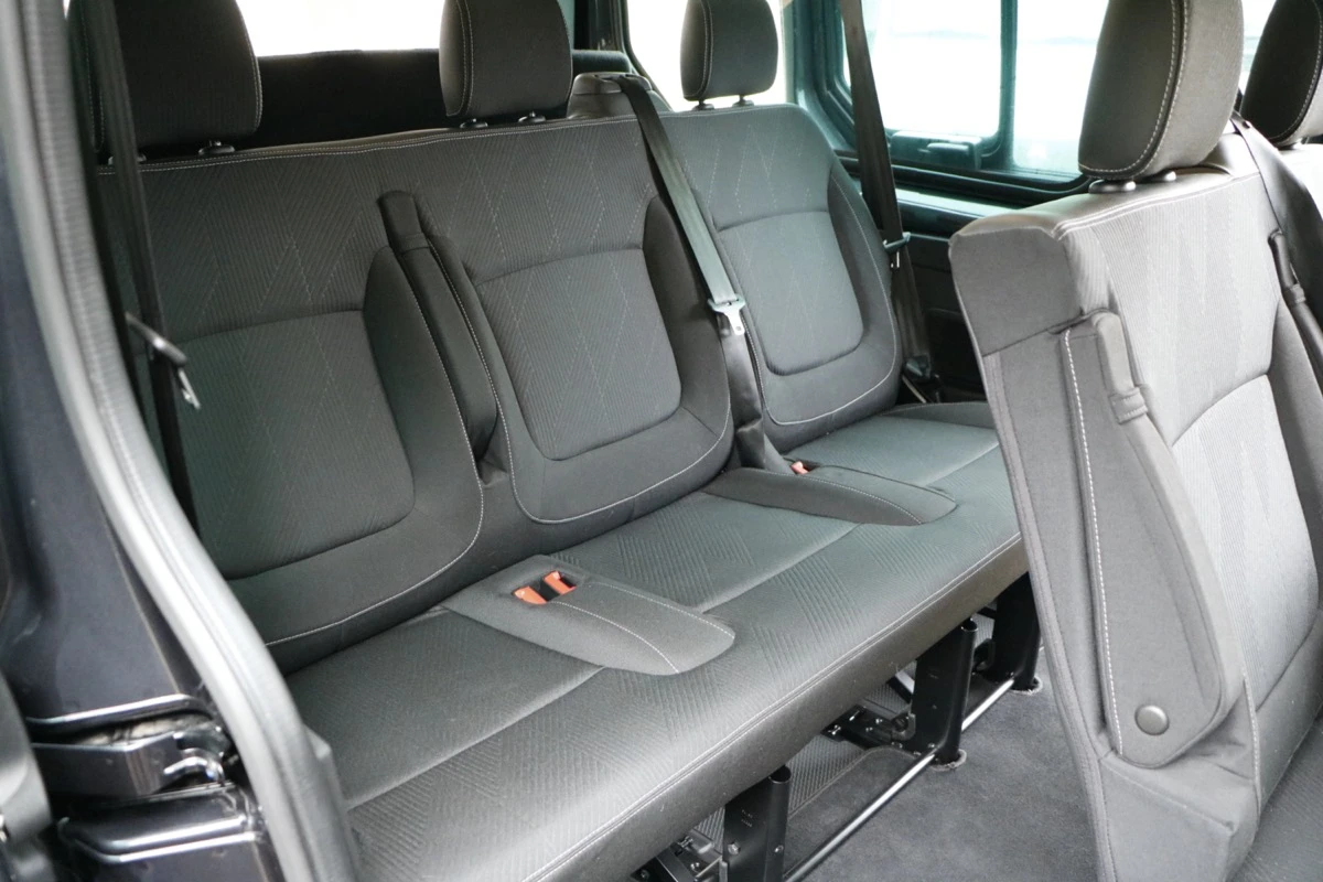 Kanapy są właściwie identyczne jak w moim Traficu – perfekcji poprawić się nie da. Osiem osób w Primastarze jedzie wygodniej niż w dowolnym aucie osobowym. Nissan miał też coś, czego bardzo brakuje mi u mnie: drzwi przesuwne z obu stron nadwozia. Z prawej odchylamy fotel i wpuszczamy pasażerów na III rząd, z lewej wsiadają pasażerowie rzędu środkowego, dużo szybciej i łatwiej niż przy drzwiach z jednej strony. Tak tylko mówię, gdybyście konfigurowali sobie Primastara – nie ma sensu brać z drzwiami tylko z prawej strony (to może jednak być trudne, o czym wspomnę na końcu).
