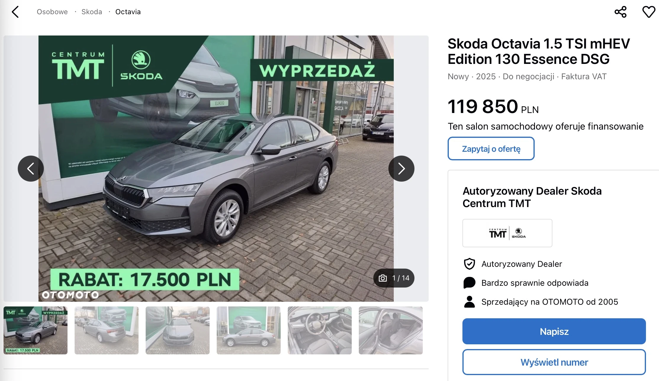 Trochę się już ten model zapomniał na rynku, ale wciąż można go uznać za dobrą propozycję. Wygląda ciekawie, przyjemnie jeździ, a do tego uraczy nas milionem fizycznych przycisków na desce rozdzielczej. Niestety - w przypadku tego egzemplarza - uraczy nas też manualną skrzynią biegów. Najwyraźniej auta ładniejsze od Octavii już tak mają.