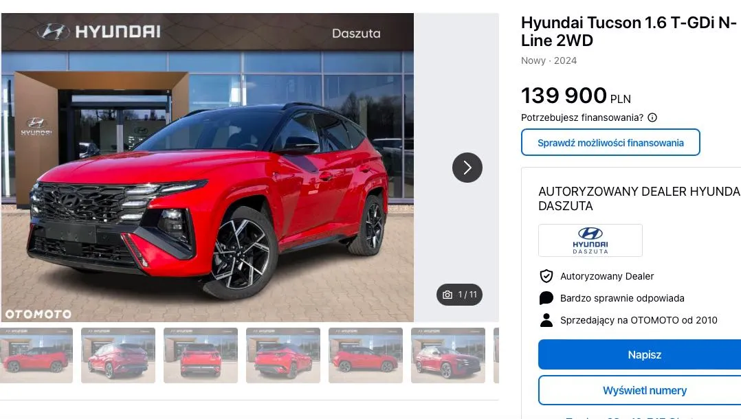 Hyundai Tucson N-Line za 139 900 zł. To rzadka sytuacja, że jednocześnie producent na swojej stronie umieszcza cennik „wyprzedażowy” dla danego modelu z zeszłego roku, a potem dealer jeszcze obniża tę cenę o pięciocyfrową wartość. W cenniku dla wersji N-Line z manualną skrzynią biegów widnieje wartość 150 900 zł, więc dostajemy jeszcze 11 000 zł zniżki. N-Line to już najbogatsza wersja Tucsona, ale nie jestem zdziwiony że się nie sprzedał – ma jaskrawy kolor i ręczną skrzynię biegów. Gdyby był szary i z automatem, dawno by go nie było.