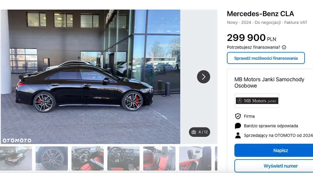 I na koniec coś z zupełnie innej beczki: Mercedes CLA 35 AMG za 299 900 zł. Jest to o tyle nietypowe, że przy samochodach tego typu cena nie jest najważniejsza i często kupuje się coś droższego, żeby było widać, że mamy... coś droższego. W ogłoszeniu pada informacja, że cena z cennika to 344 tys. zł, więc w teorii mamy tu do czynienia z rabatem na poziomie 13 proc., czyli nie za wiele w procentach, za to dużo w liczbach bezwzględnych. Problem w tym, że samochody z segmentu premium są konfigurowalne na tak wiele sposobów, że utrudnia to cennikowe porównania. Warto jednak odnotować, że nawet tak gorący towar jak Mercedes z logo AMG może trafić do wyprzedaży rocznika. Obstawiam, że to przez czerwone wnętrze.