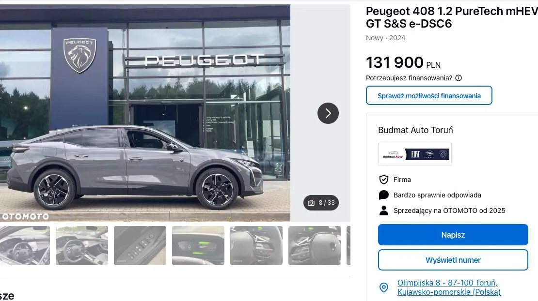 Peugeot 408 GT za 131 900 zł. Cena katalogowa tej wersji to obecnie 164 600 zł, więc mamy 19,9 proc. rabatu. Oczywiście z zastrzeżeniami, że to cena dla klienta biznesowego i przy finansowaniu, ale to wszystko jest – jak ostatnio sprawdziłem – do dogadania. Zaletą Peugeota 408 jest to, że wspaniale wygląda, nie jest kolejnym SUV-em i świetnie wygl... a nie, to już było. Wada to wciąż ten sam, niezbyt żwawy silnik 1.2, tym razem połączony z układem hybrydowym. Gdyby to jeszcze miało w tej wersji jakieś 4-cylindrowe 1.6 Turbo, to już naprawdę ocierałoby się o premium.