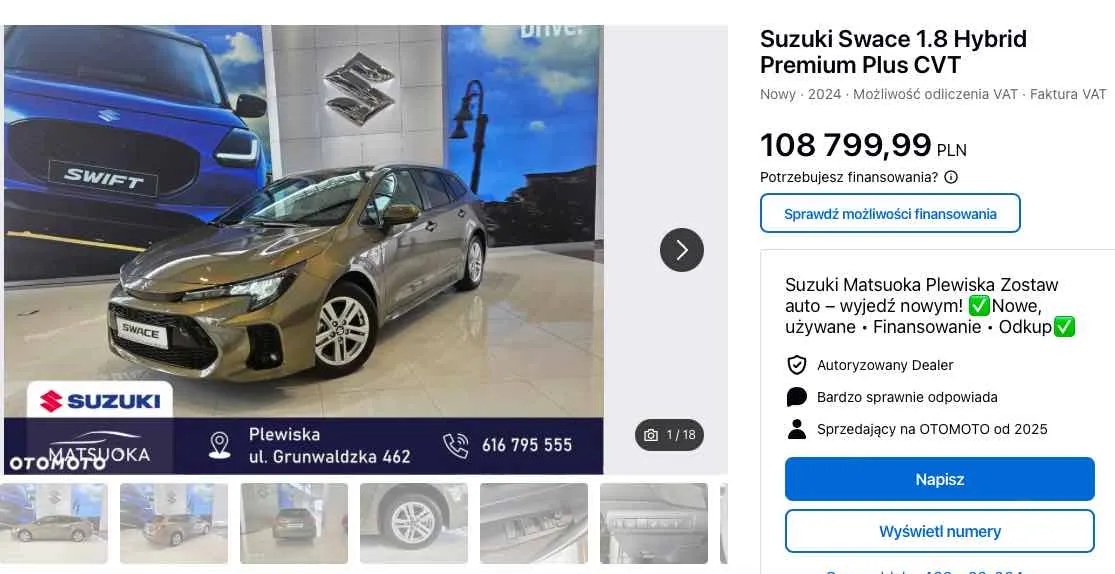 Suzuki Swace za 108 tys. zł. To właściwie Corolla kombi z hybrydą, różnica ogranicza się do znaczka – to jeden z mniej postaranych przykładów sprzedawania cudzego wozu pod własną marką. Technicznie mamy Toyotę Corollę, czyli najpopularniejszy samochód w Polsce. Nie powinno być problemów ani z niezawodnością, ani odsprzedażą, a cena to już trochę poziom Dacii – za w sumie duże kombi, może z przeciętnym wyposażeniem, ale bez wstydu. Zwracam uwagę jednak, że ten poziom wyposażenia odpowiada Corolli w wersji Style, którą w cenniku mamy za 135 200 zł – można to poznać po obecności podgrzewanych foteli i kierownicy. Czyli korzyść wynosi tu 19,6 procent, to już naprawdę coś.