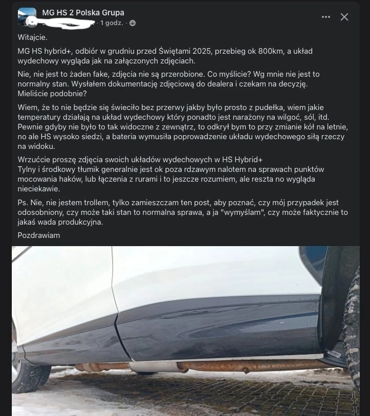 Autor twierdzi, że jego SUV ma dopiero miesiąc i przez ten czas przejechał ledwo 800 km. Mimo to stan wydechu jest godny jakiegoś starego Opla lub Mazdy, a nie nowego samochodu. Nabywca jest szczerze zdziwiony i zastanawia się co się dzieje. Zapytacie, Paweł, ale czemu ten wydech jest tak nisko? Odpowiem, że to dlatego, że wspomniany samochód jest hybrydą, a nad wydechem znajduje się bateria. Dlatego musiał zostać poprowadzony nisko. Przez to jest narażony na wilgoć, sól drogową i inne niekorzystne działania.