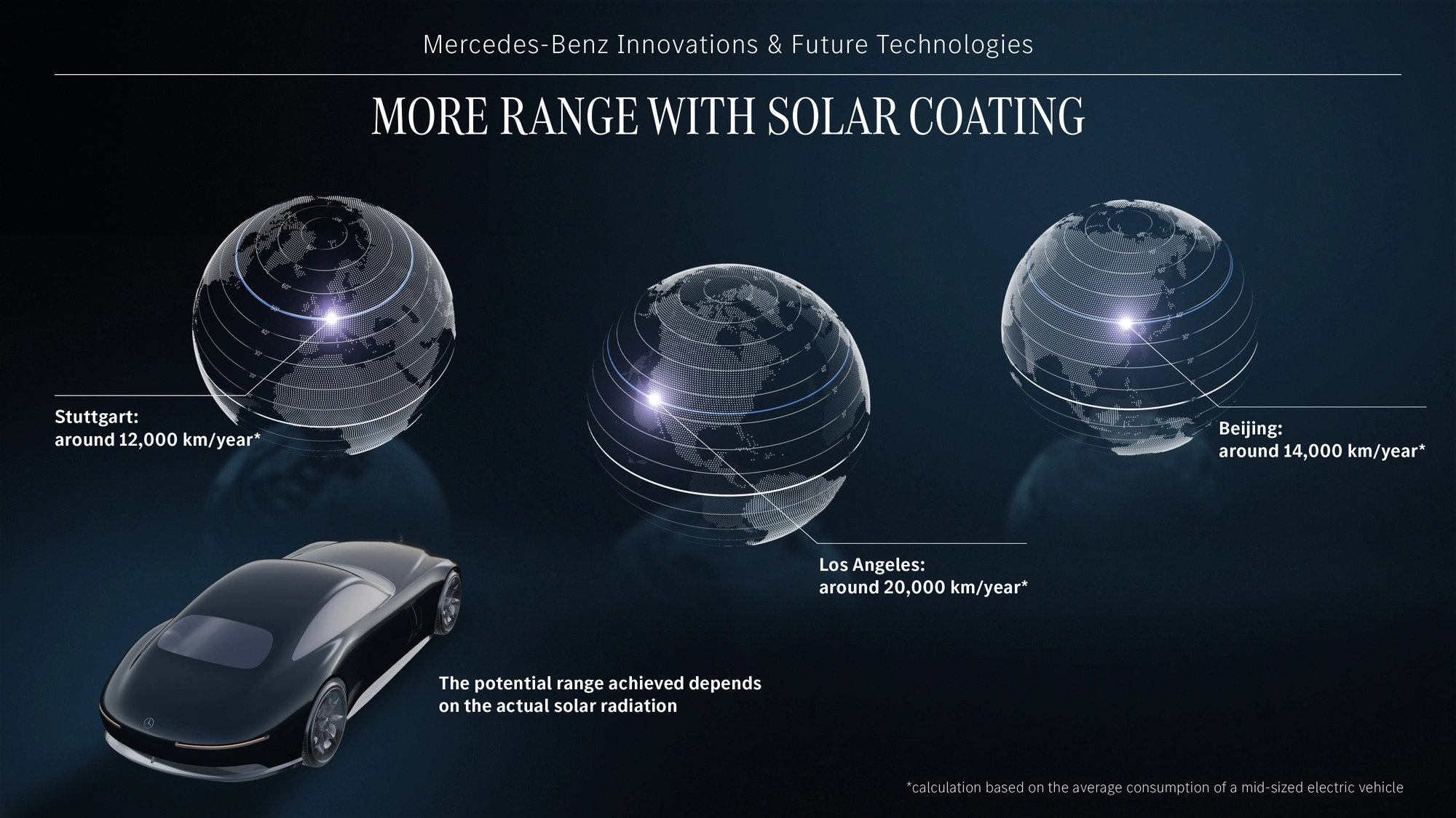 Nowy Mercedes Vision Iconic korzysta z powierzchni aktywnej fotowoltaicznie z ogniwami słonecznymi. Według producenta taka powłoka pozwoliłaby na zyskanie nawet 12 tys, km zasięgu w ciągu roku, ale z racji tego, że to żadna nowość, to doskonale wiemy o tym, że można to włożyć pomiędzy bajki. Coś tam doładuje, ale nie liczcie na 12 tys. km. Jak będzie 1200 km, to już będzie to sukcesem. Po prostu nie mamy aż takich sprawnych ogniw, a straty energii przy przetwarzaniu promieni słońca są dosyć spore. Jednak każdemu wolno marzyć.