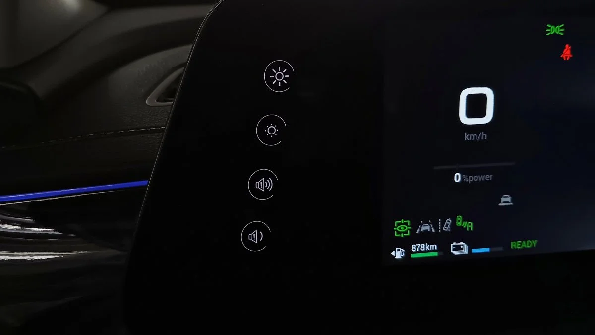 Gdy pierwszy raz wsiadłem do prasowej Omody 5 Hybrid, było już po zmroku i dlatego moją uwagę przykuły podświetlone, dotykowe przyciski znajdujące się z lewej strony cyfrowego zestawu wskaźników. Dwa z nich odpowiadają za rozjaśnianie i przyciemnianie wyświetlacza, natomiast dwa pozostałe ewidentnie służą do regulacji głośności.